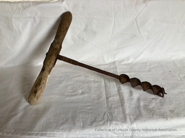 Iron and steel with a turned wooden handle. Has 4 spirals. Upper half of shaft is wrought iron and lower half is carbon steel. The shank extends through the wooden handle and ends with a hammered rose head.
