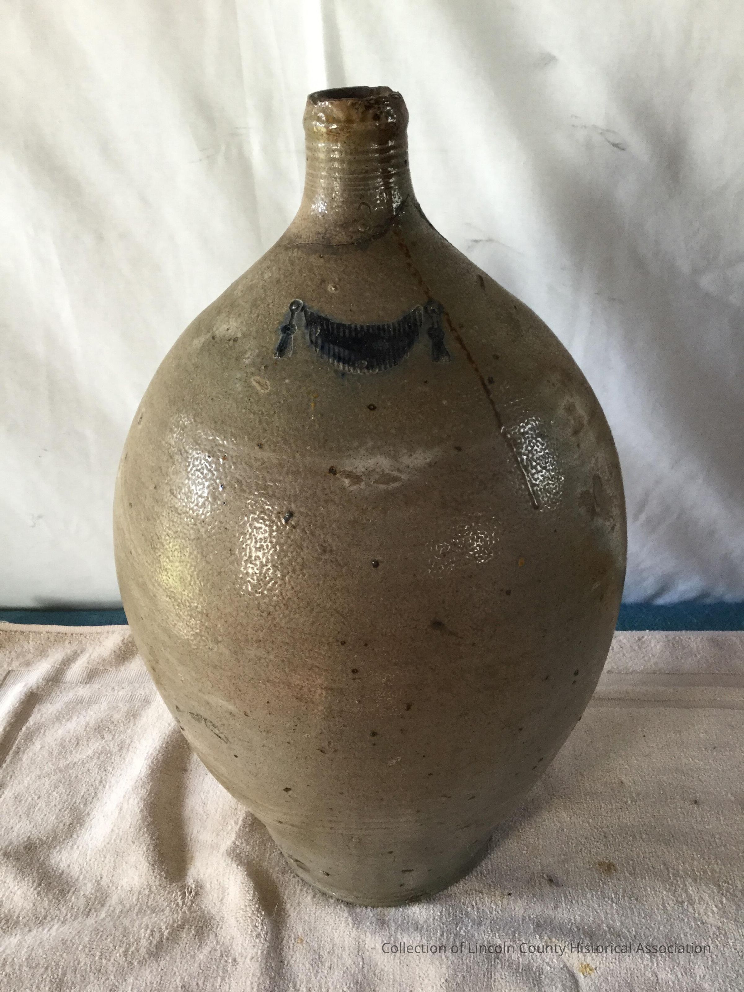 Three gallon stoneware jug in an ovoid shape and with gray glaze. Bears a swag on shoulder colored cobalt blueMade/Created