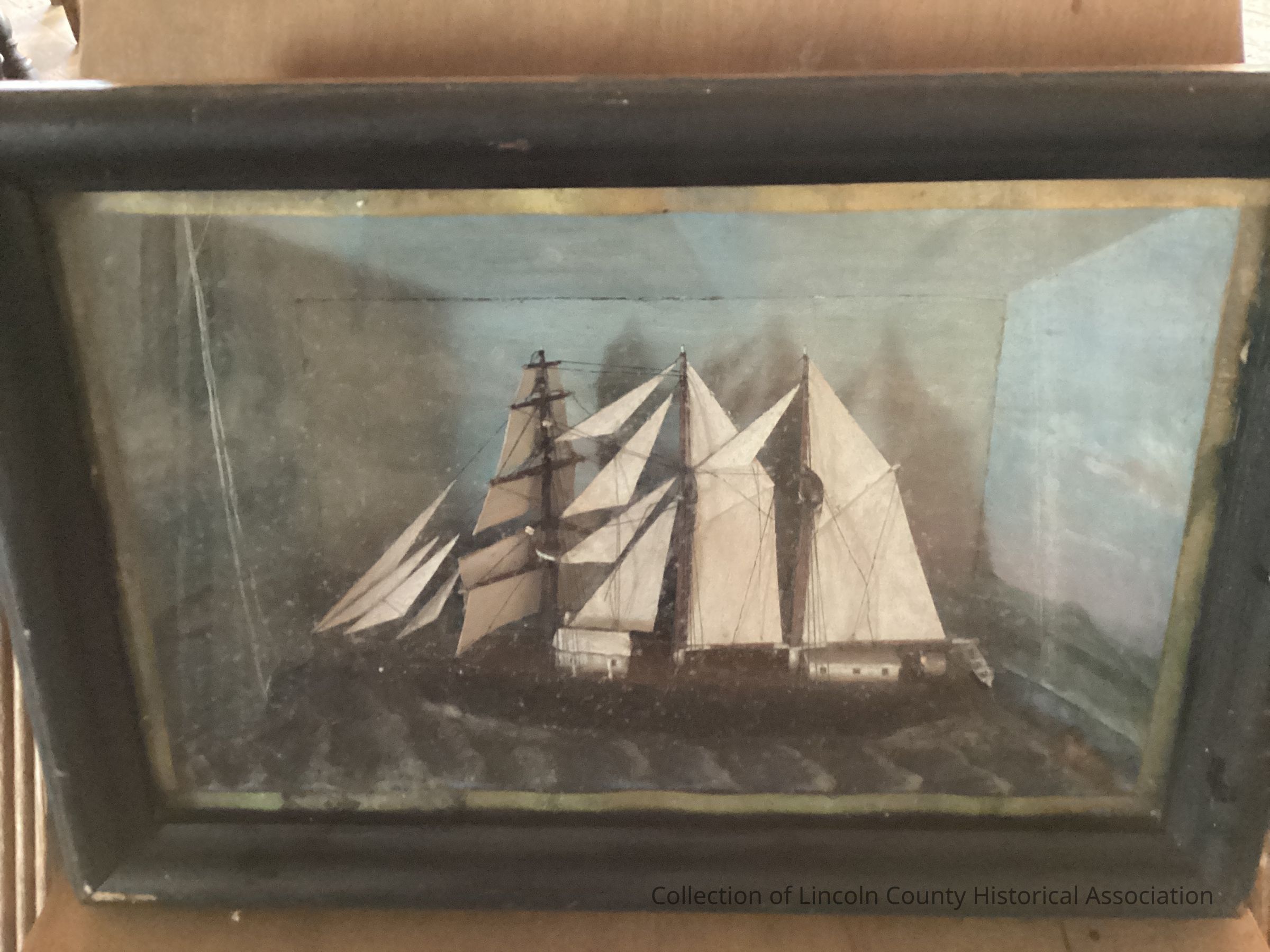 Model of a Brigantine. Framed as a "ship diorama." Wood and paint.Made/Created