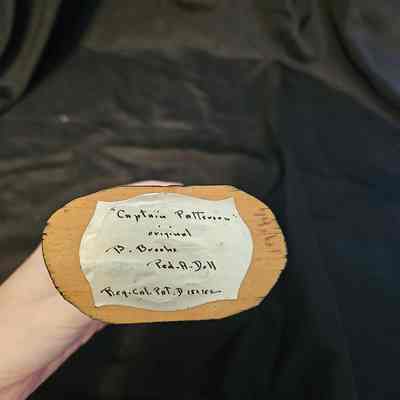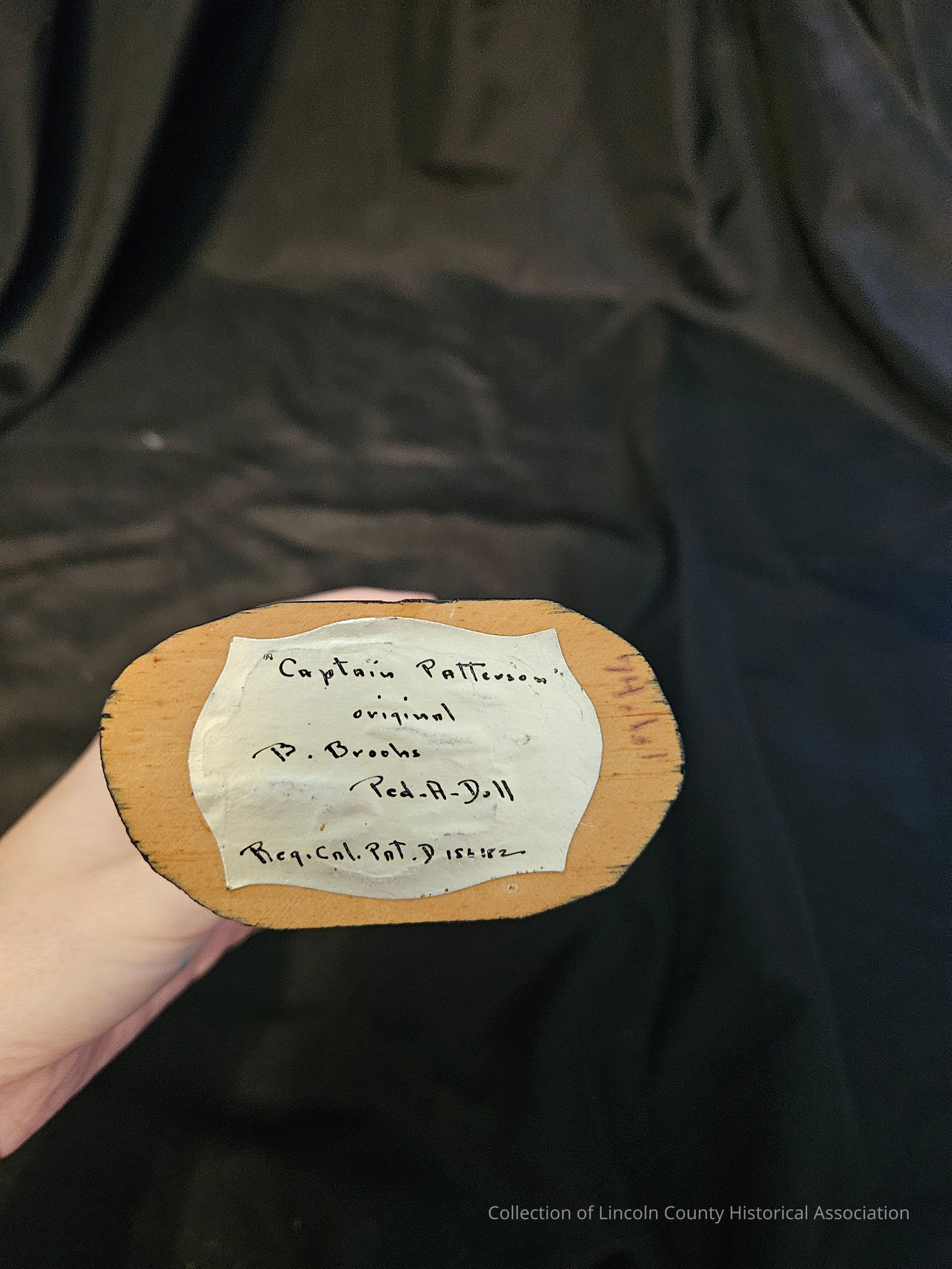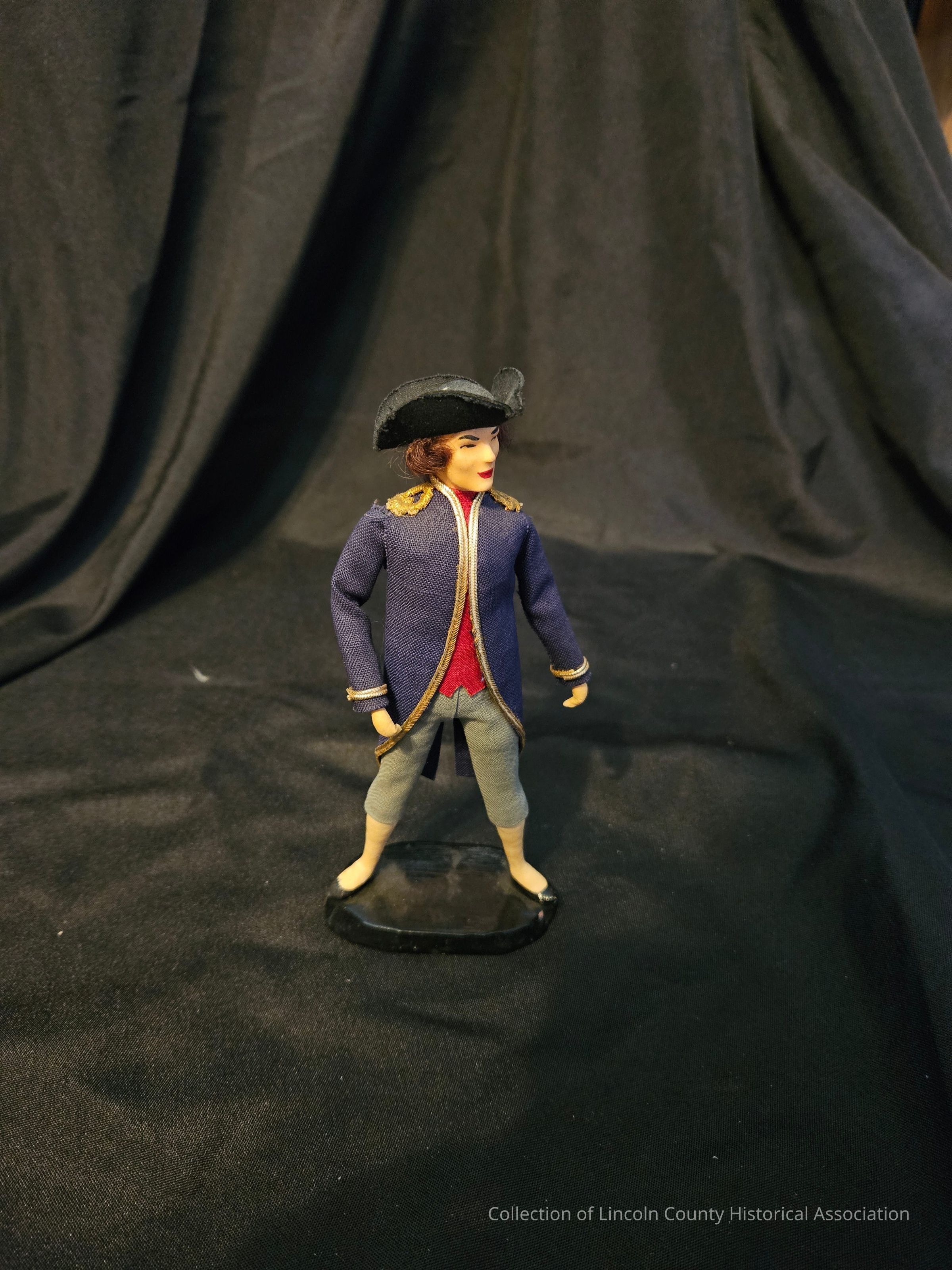 Doll meant to represent the "Captain Patterson" character from the "Away Goes Sally" book series by Elizabeth Coatsworth of Nobleboro, ME. "Away Goes Sally" takes place in the 18th century and follows a family moving from Massachusetts to Maine. The series was originally published in 1934.