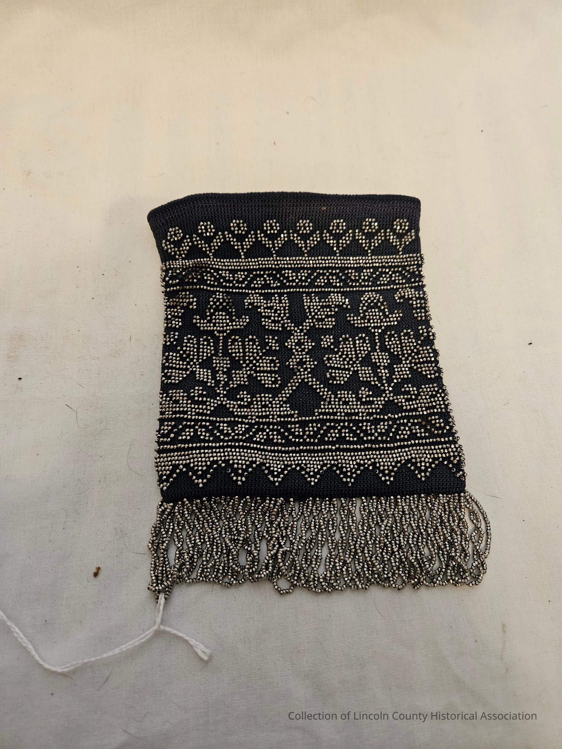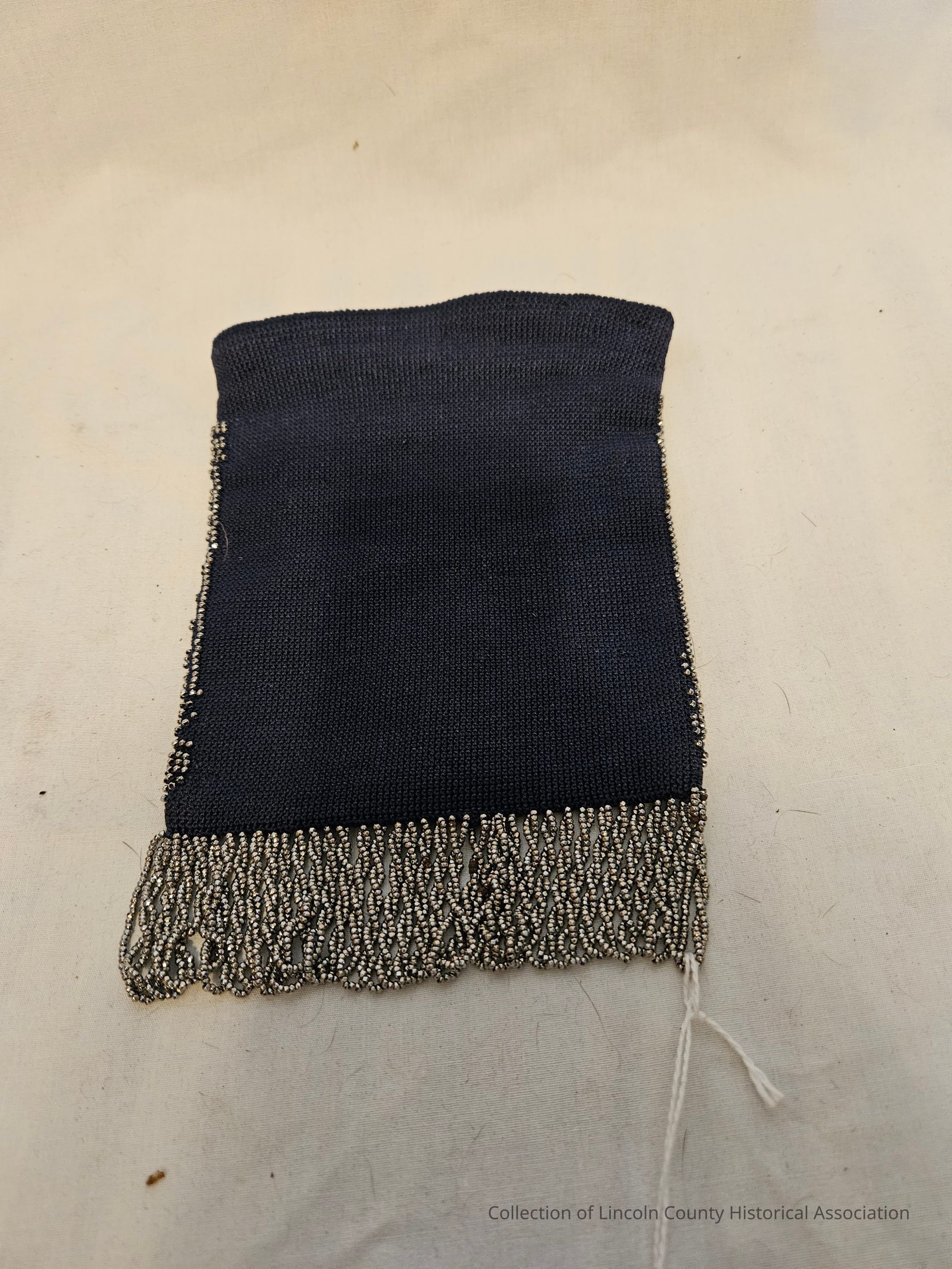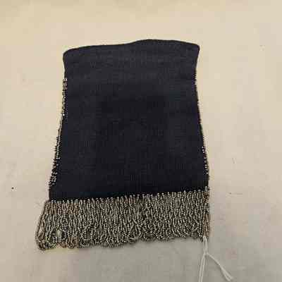 Navy blue pouch/purse with silver beaded floral design on one side. Silver beaded fringe. Tan silk lining.Made/Created