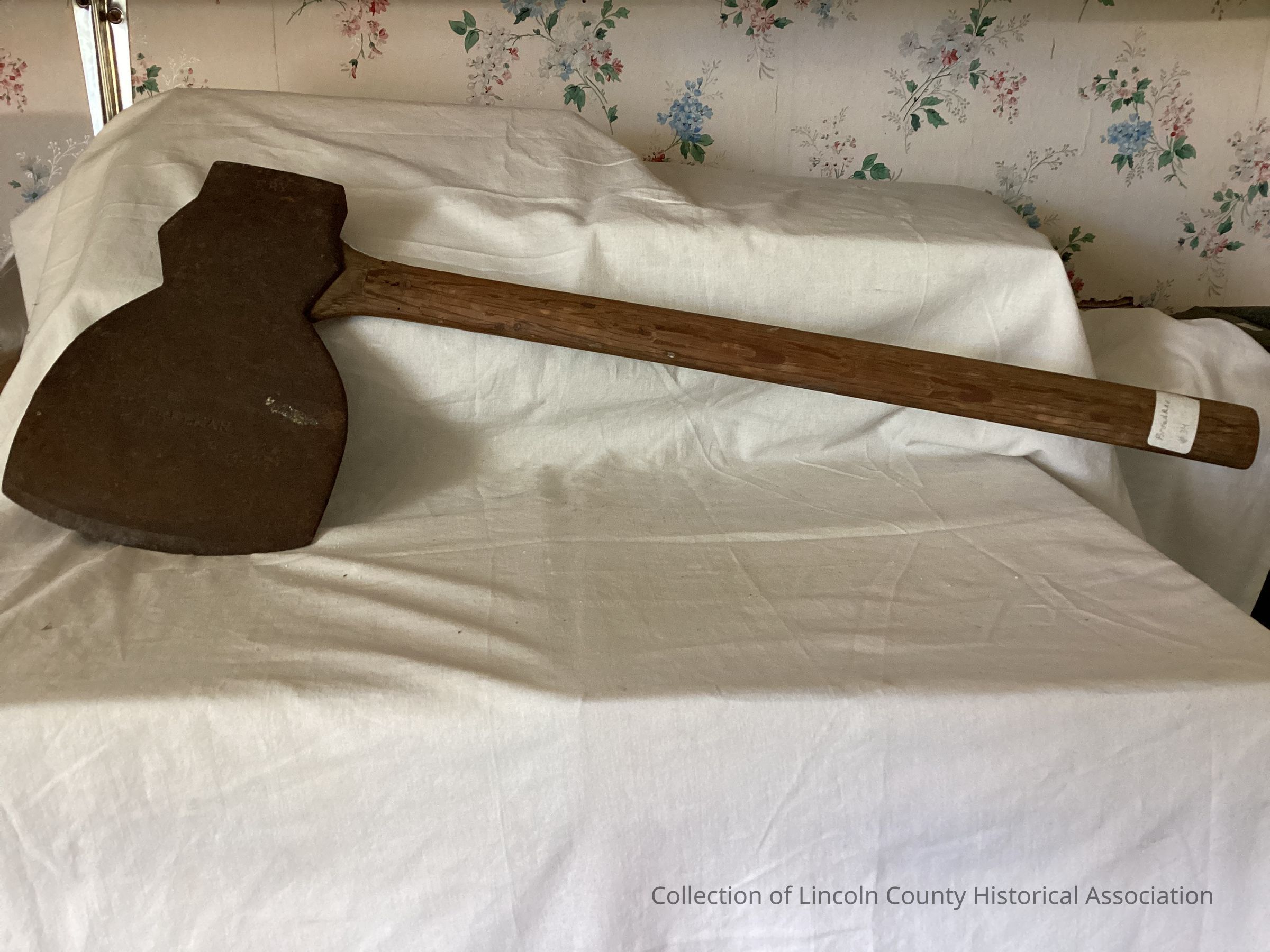 Hand forged iron broad axe with a wooden hickory handle. Double bevel on blade with steel overlay. Handle is somewhat bent.