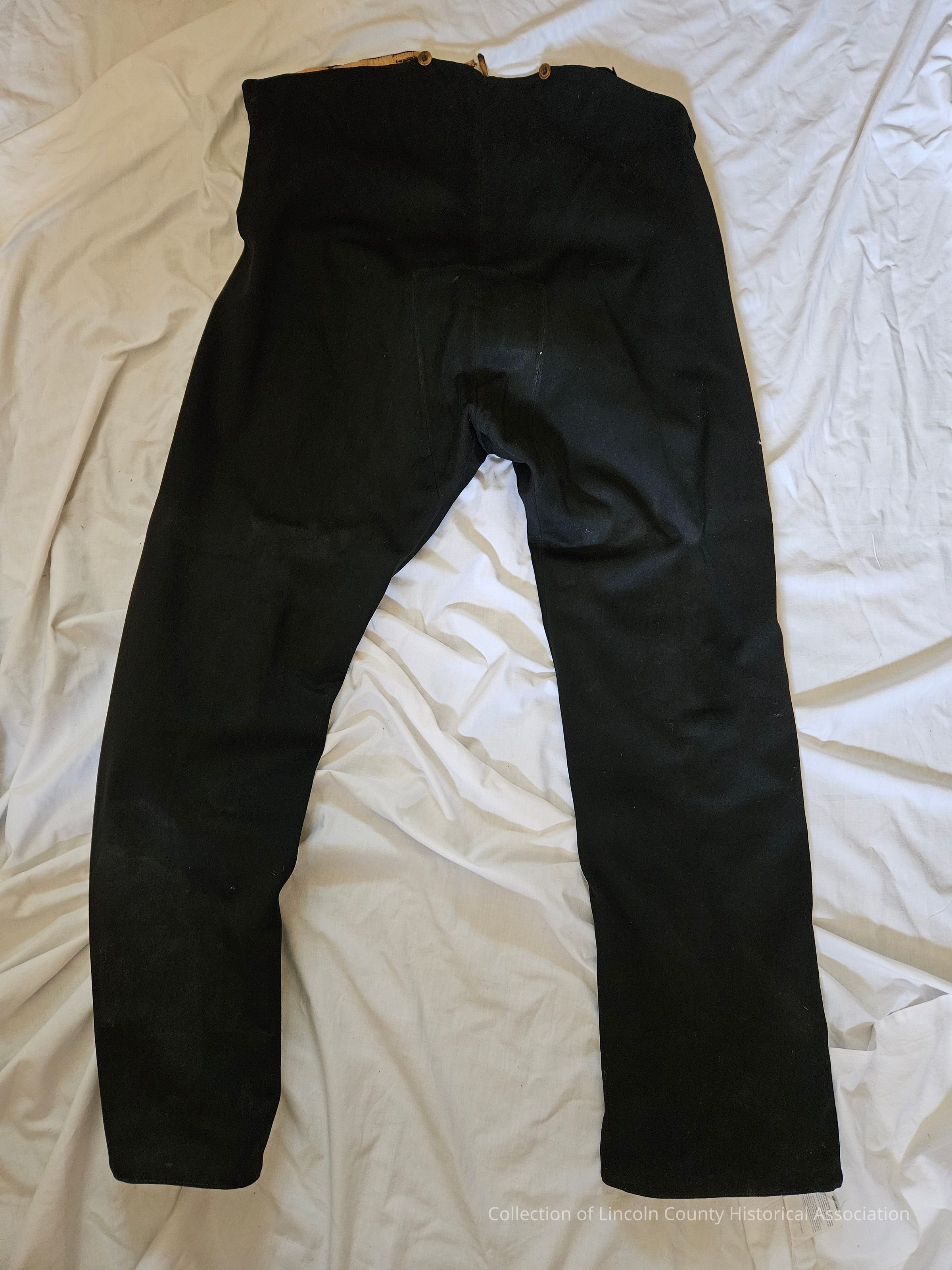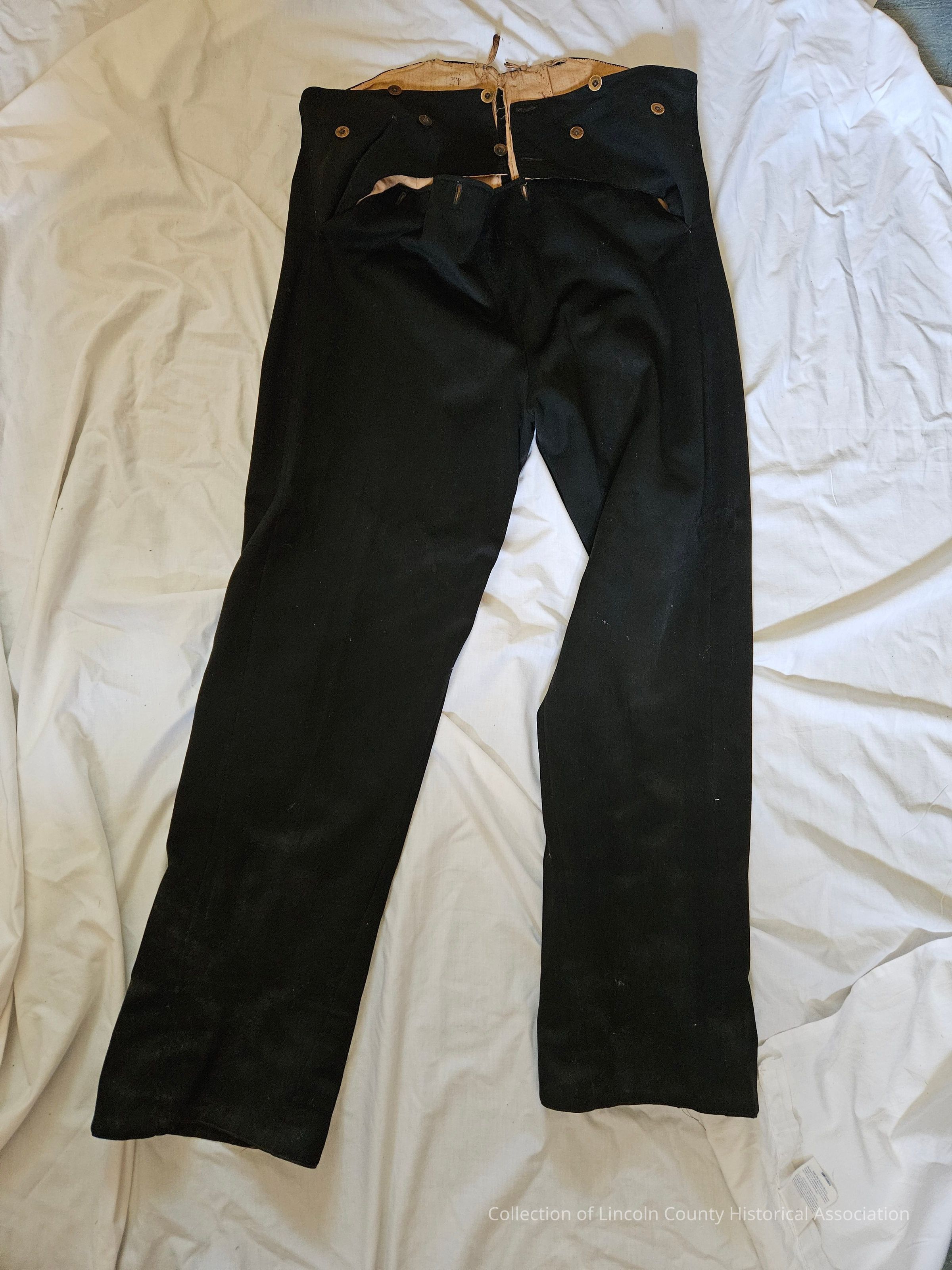 Men's black wool pants. Tan cotton lining. Drop front with two panels that have three buttons each. Two buttons at back of waist as well. Hand stitched.