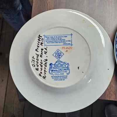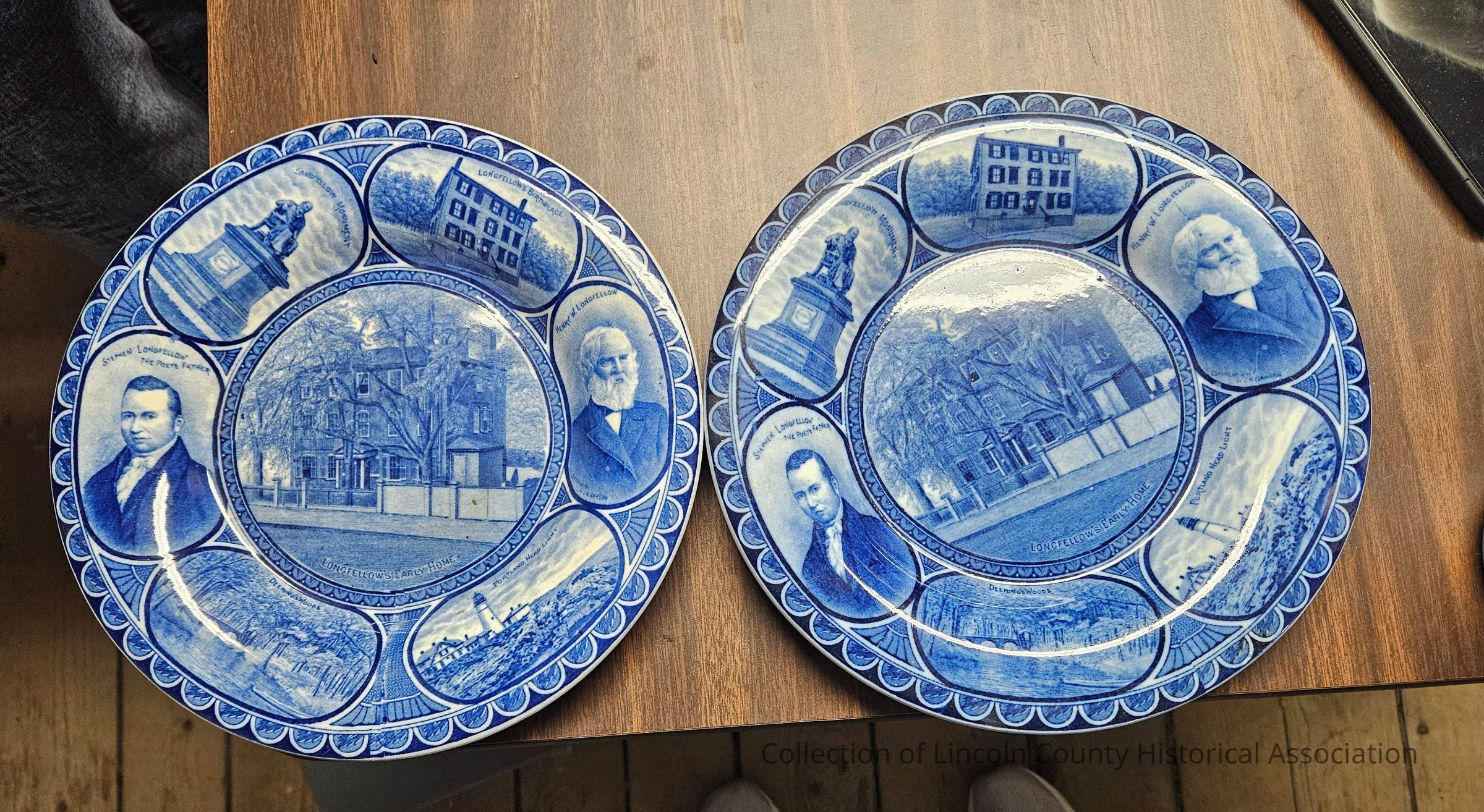 Pair of dark blue transferware plates. Scene in center is of Longfellow home. Around edge are images of Henry W. Longfellow, Stephen Longfellow, Longfellow's birthplace, Longfellow's monument, Portland Head Light, and Deering Woods.Made/Created