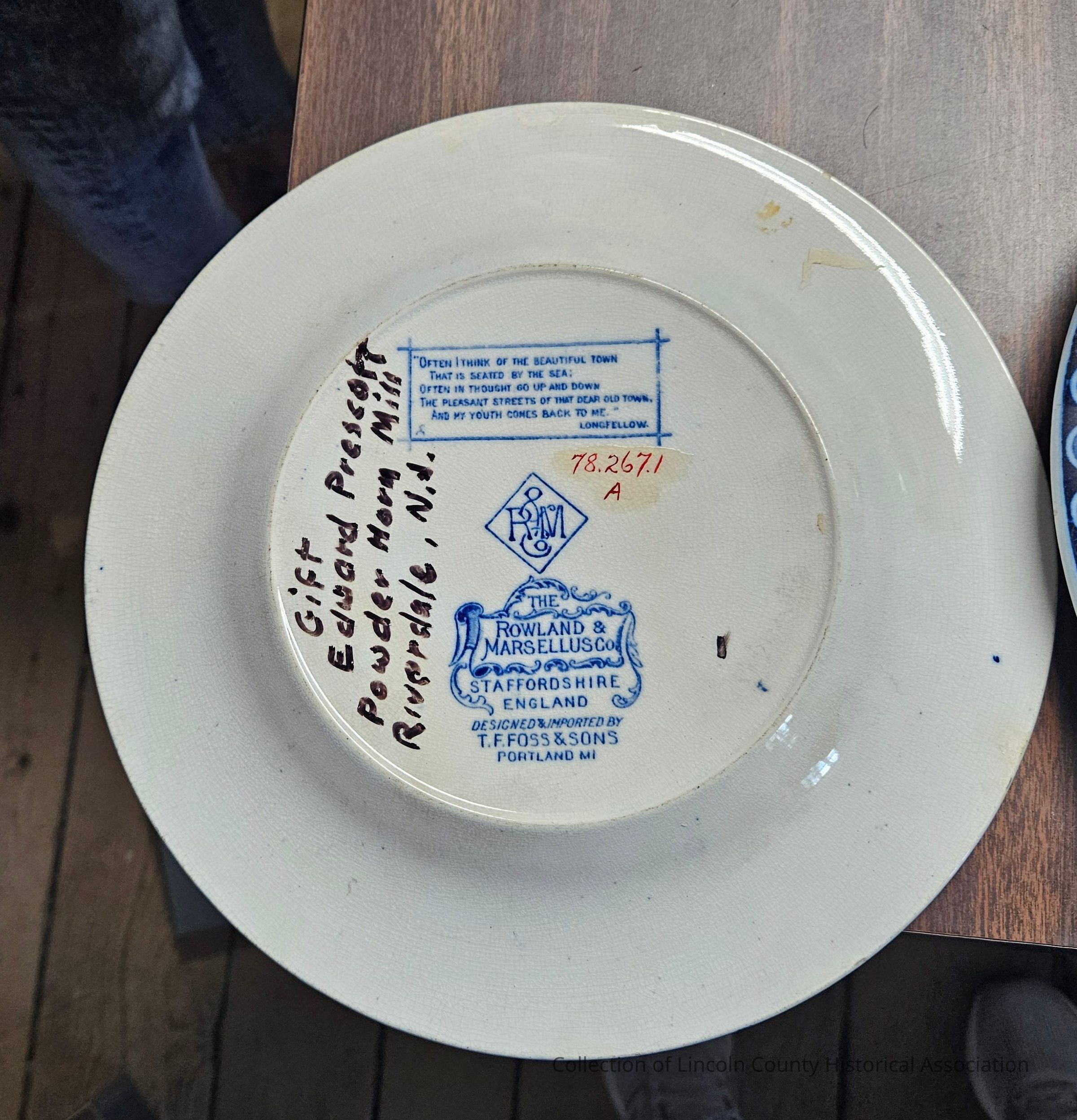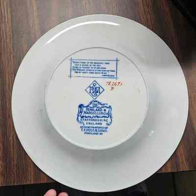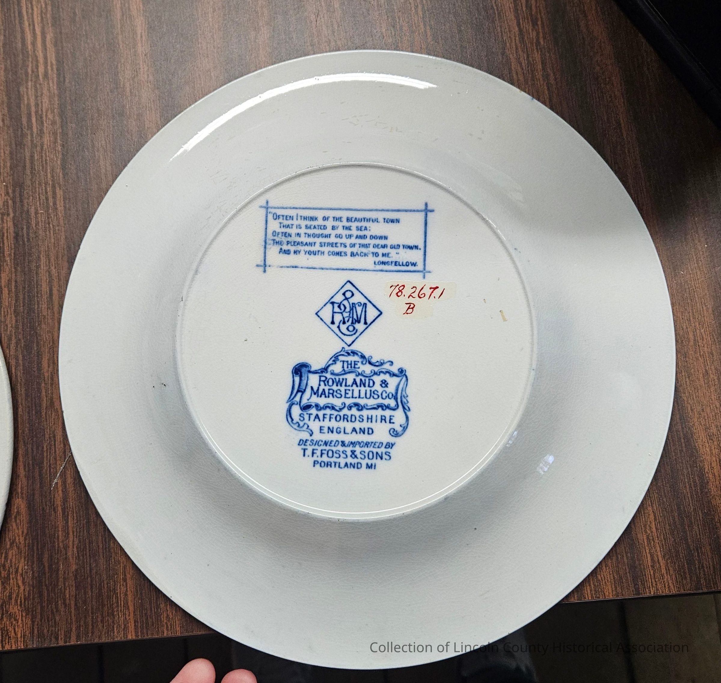"'Often I think of the beautiful town that is seated by the sea: often in thought go up and down the pleasant streets of that dear old town and my youth comes back to me- Longfellow' The Rowland and Marsellus Co. Staffordshire England Designed & Imported by T.F. Foss & Sons Portland MI"Condition
