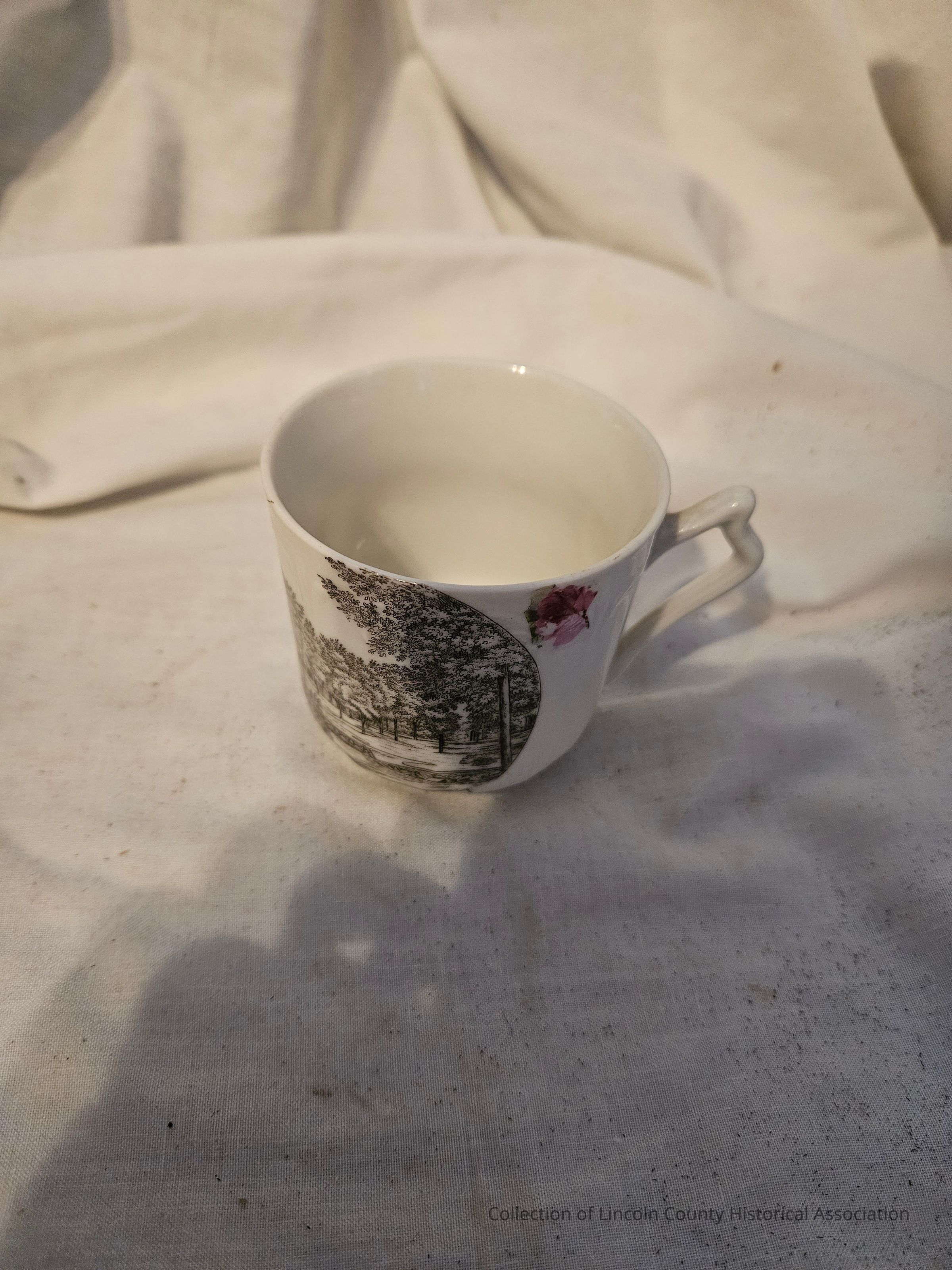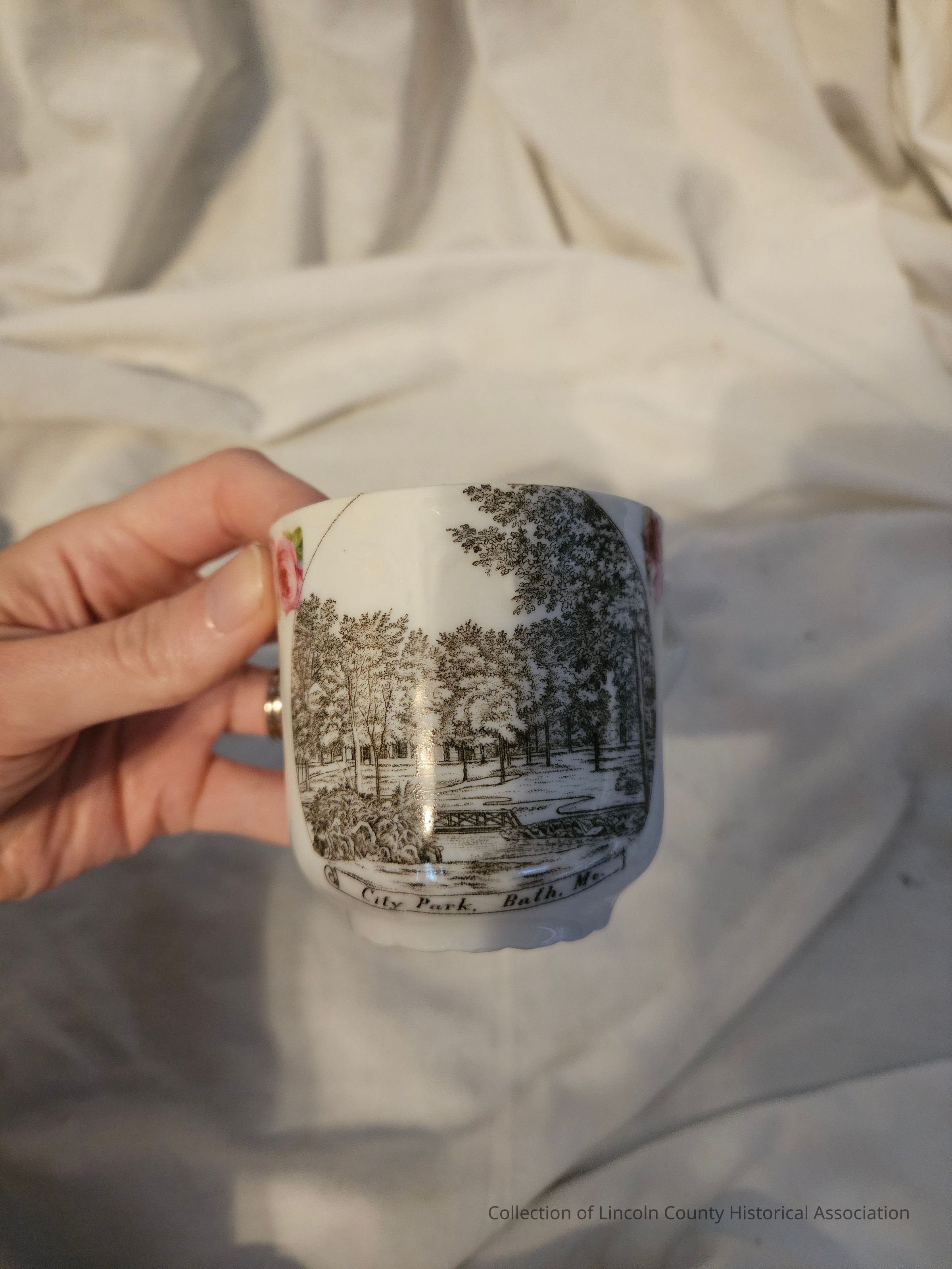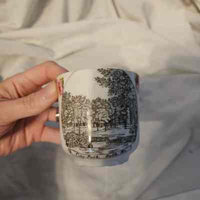 China souvenir cup. Black and white image of City Park in Bath in center. Pink flowers surround image. Has handle.