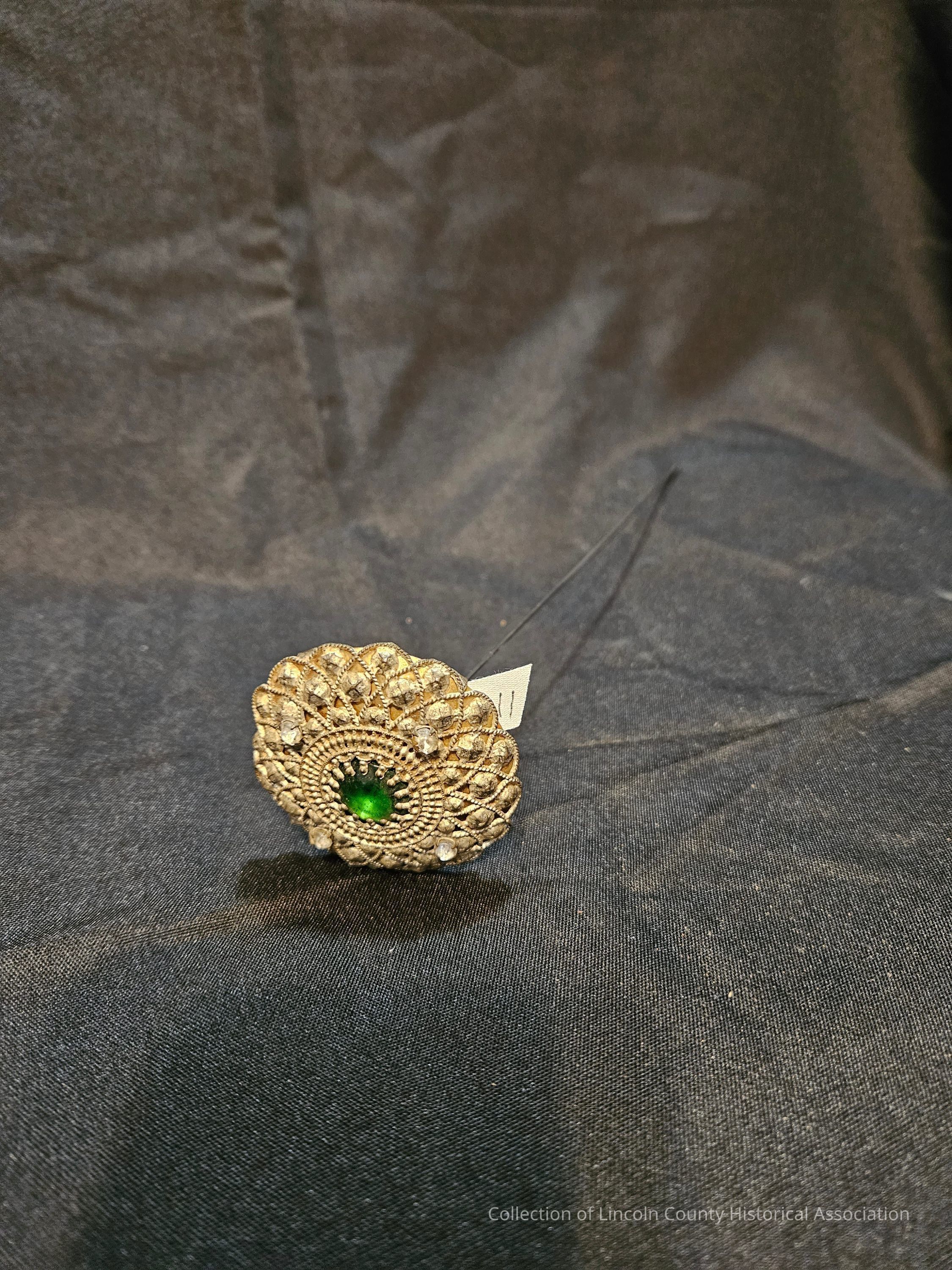 Women's hat pin. Silver colored lattice work on top of brass base. Emerald green gemstone in the center. Four white gems around center green gem. Scalloped edges.