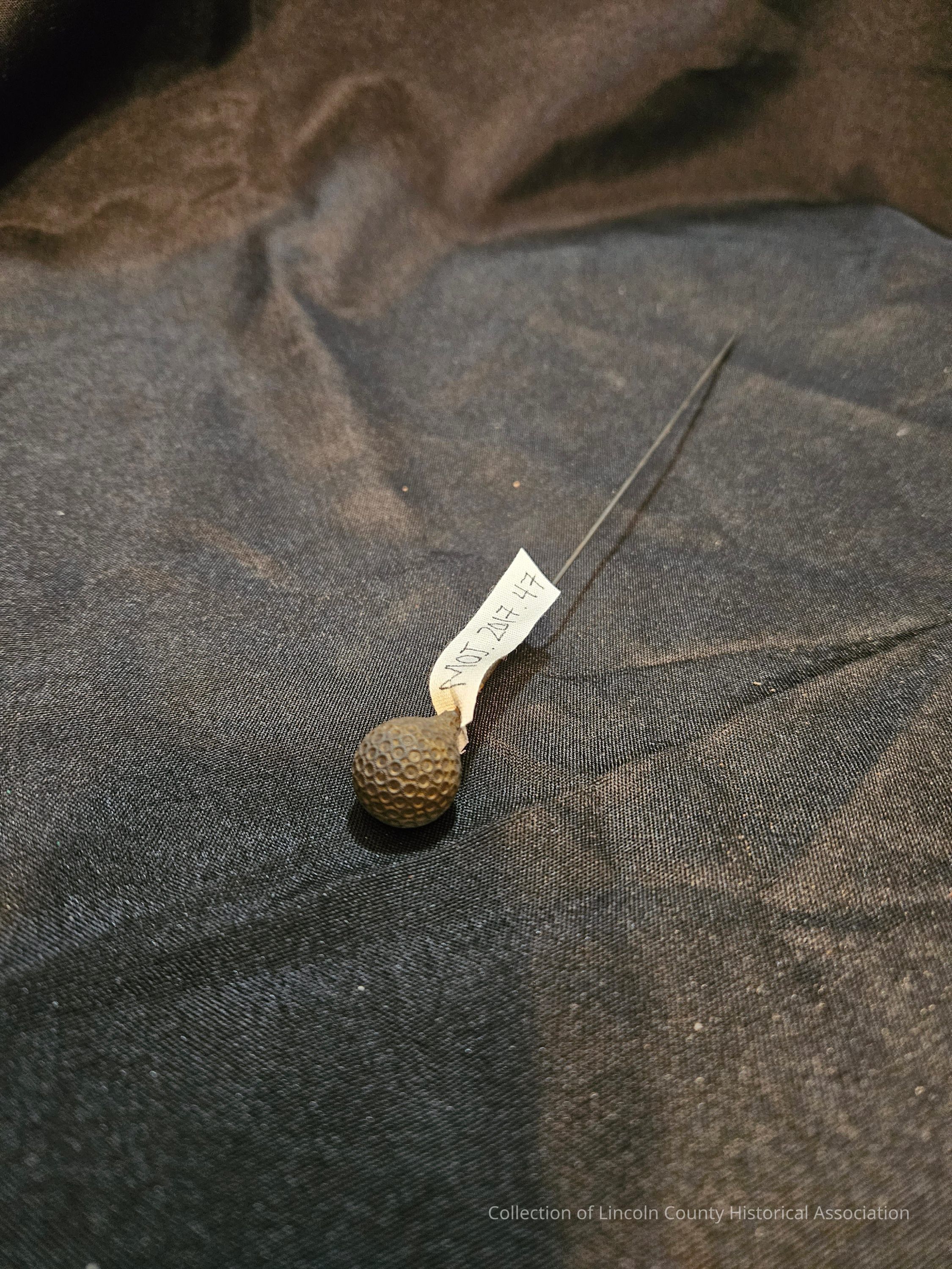 Women's hat pin. Copper ovoid ball head with circular embossed motifs.