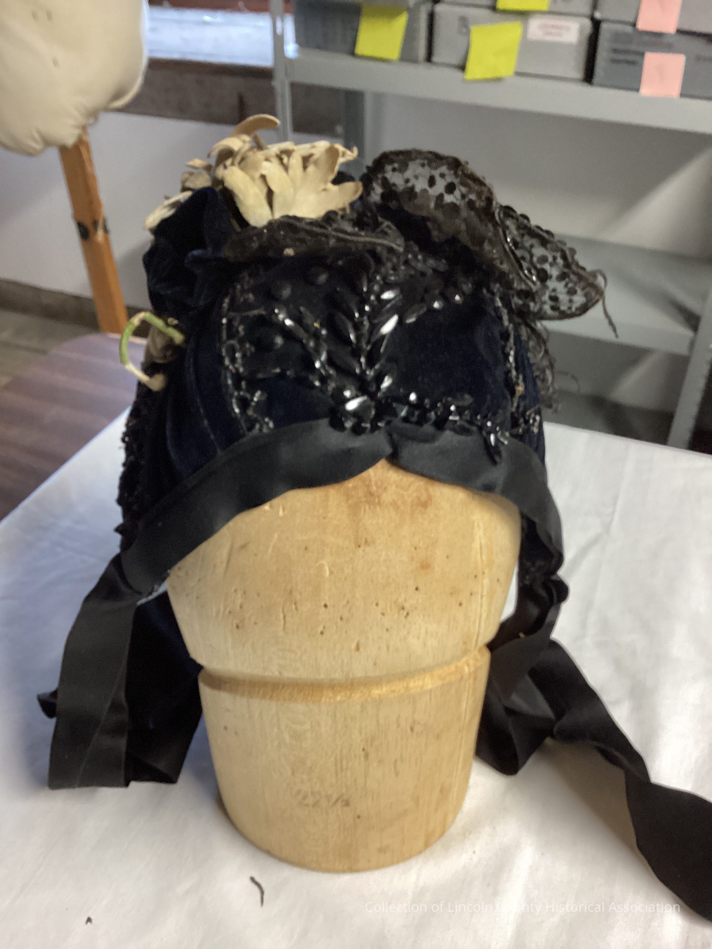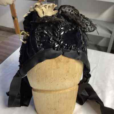 Women's black hat with two silk ribbons. Beadwork and floral design.Clothing/Dress/Costume Details