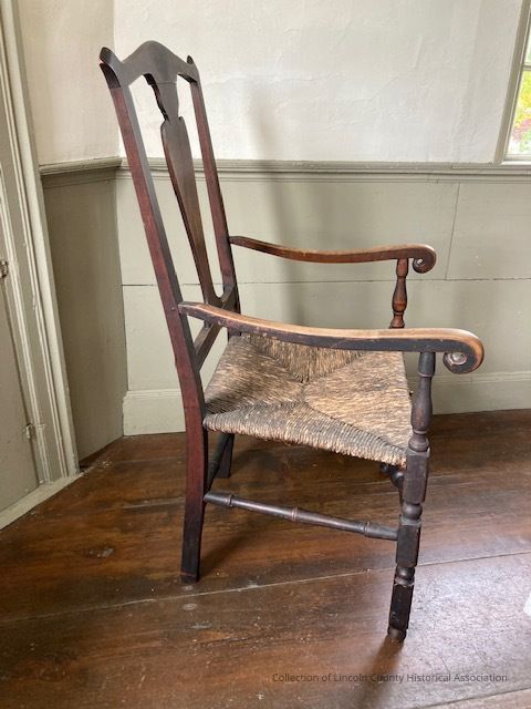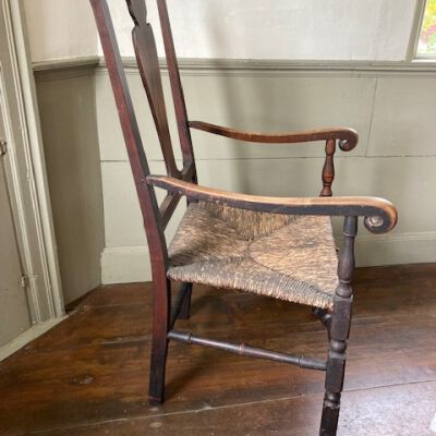 Wooden armchair with rush seat. Transitional with a Queen Anne splat, crest rail with upturned ends and arms that end in downward scrolls. Front legs turned and with ball feet. Front stretcher is boldly turned in William & Mary style. Side and rear stretchers are also turned. Rear legs & stiles are gently curved but are square shaped although the backs of the stiles are slightly chamfered. The splat is shaped with bird beak motif.