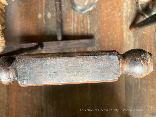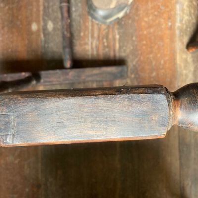 The wood would appear to be maple but has been stained a dark brown throughout except where worn as on front stretcher, top of arms and down splat.