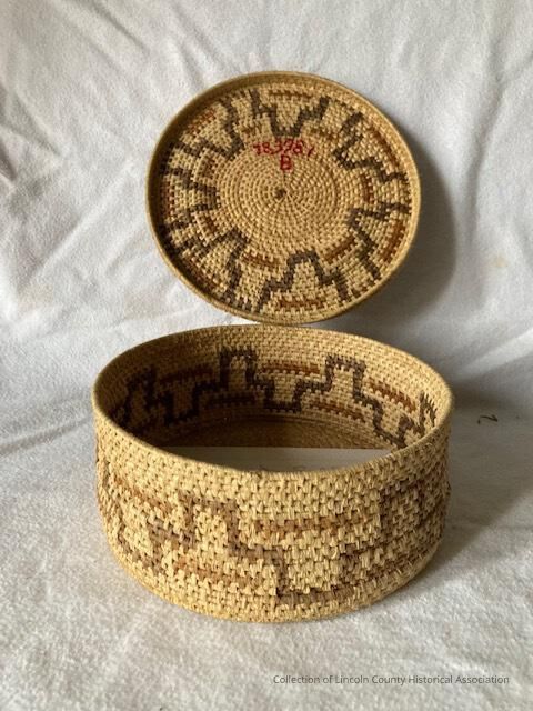 Cylindrical African coil basket with lid. Sewing Basket. Light tan in color with geometric patterns created in darker colors not necessarily of southwest Native American design.Made/Created