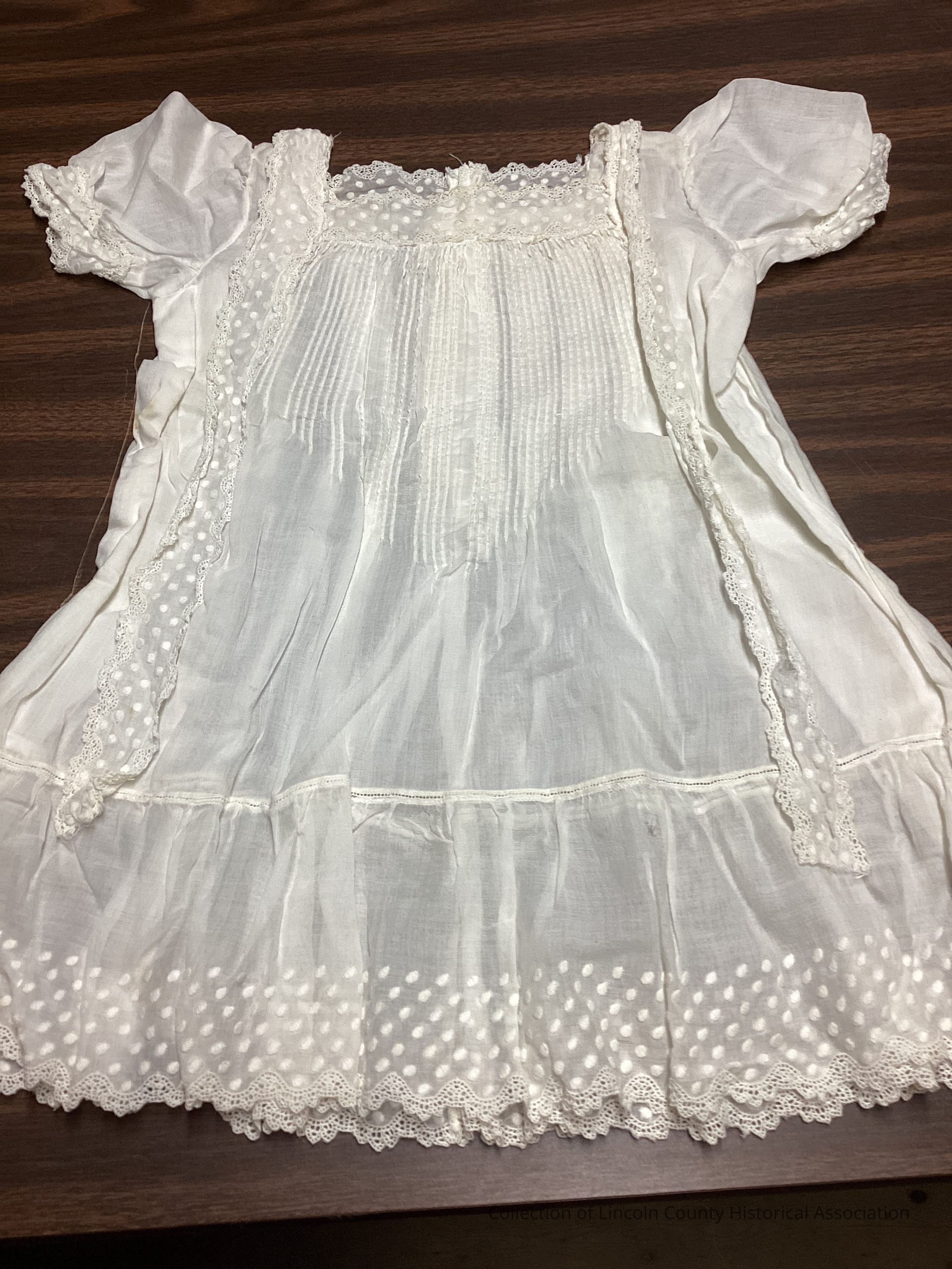 Thin white cotton child's dress. Short sleeved with tucked front bodice. Pleats down chest. Dotted Swiss Lace edging on cuffs and collar. Dots at bottom of skirt above scalloped lace edge.Clothing/Dress/Costume Details