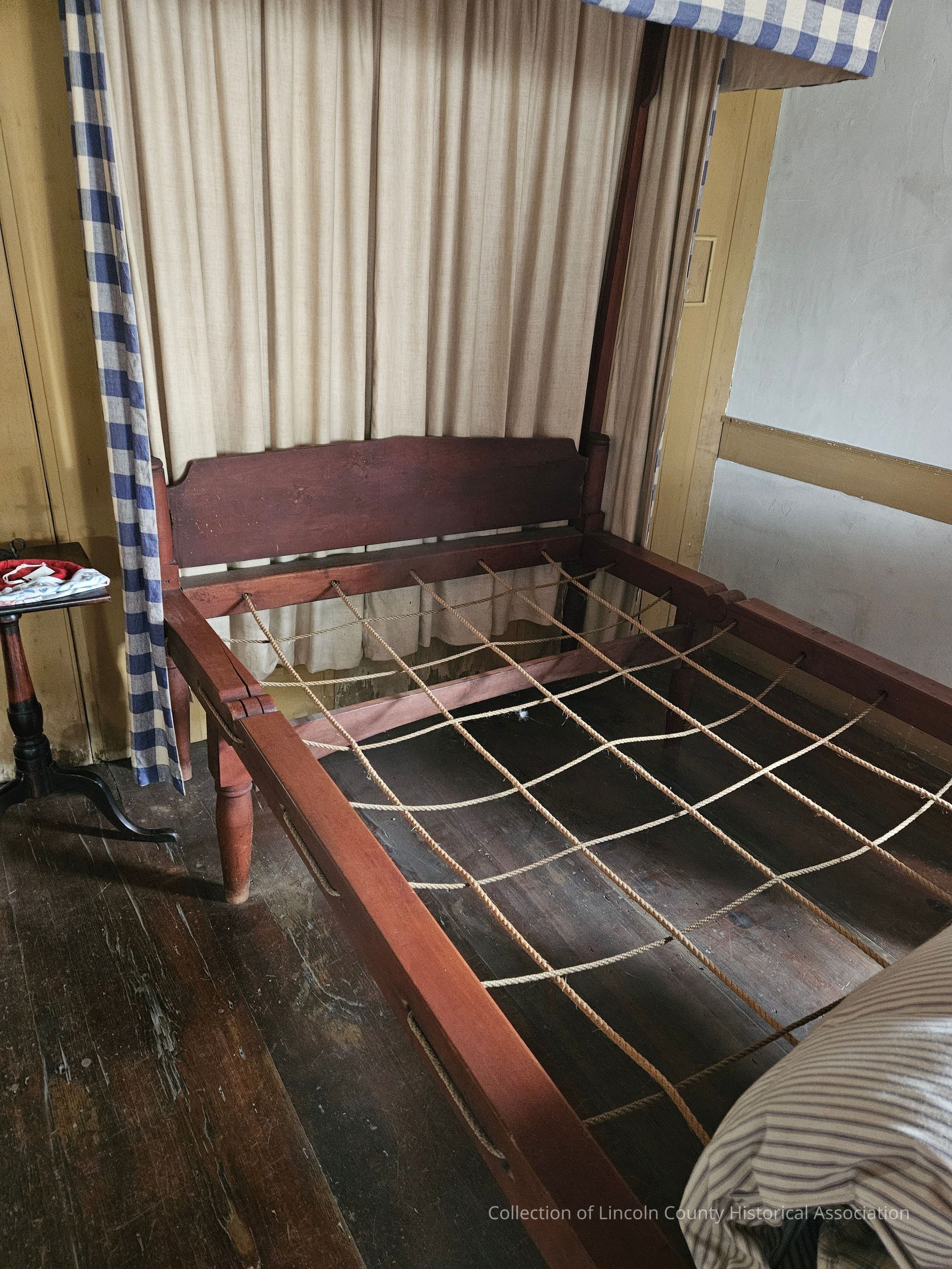 Draped back and sides with top valance. Double size. Plain base posts with tapered legs. Rope turned mattress holder.Made/Created