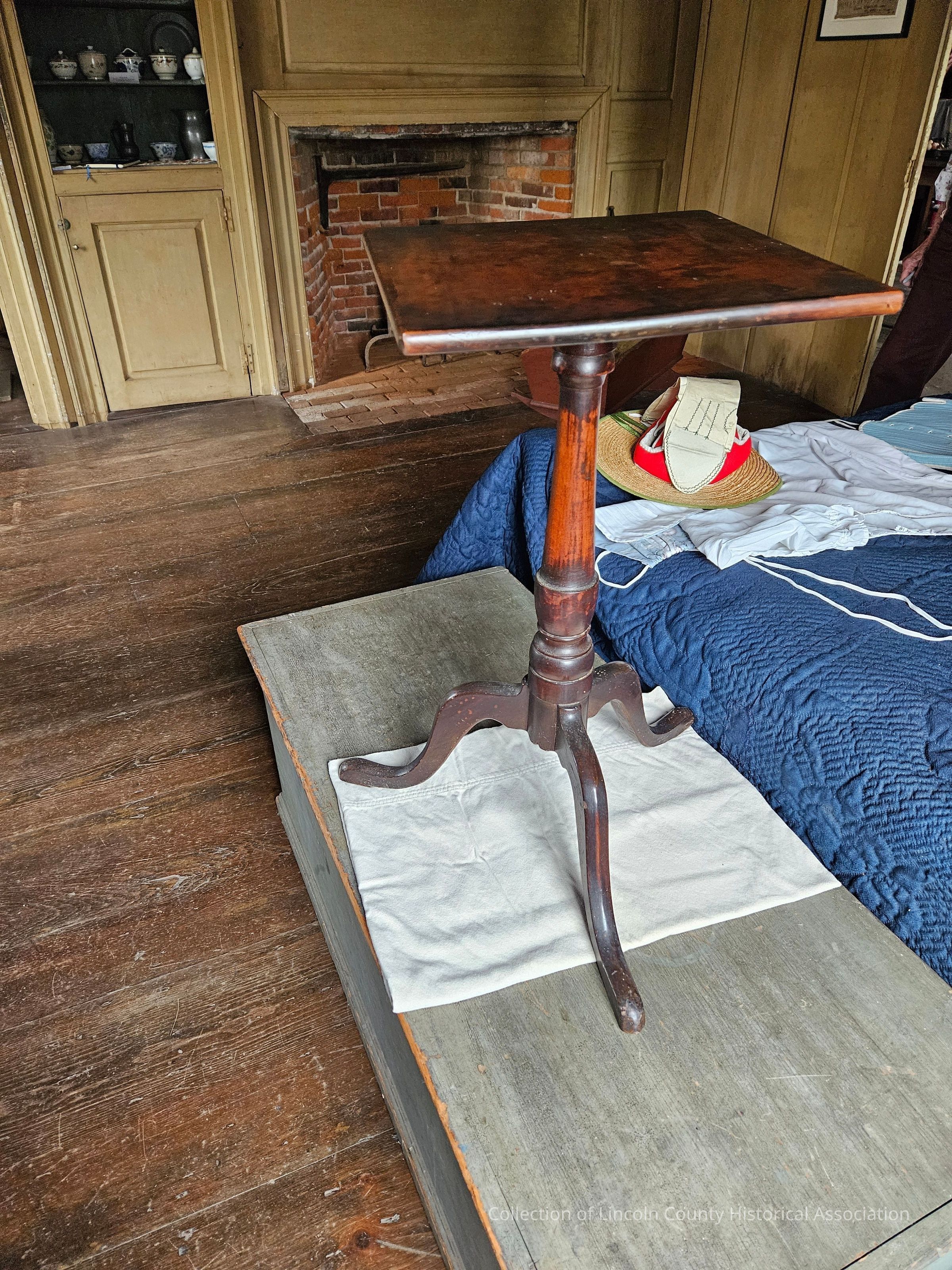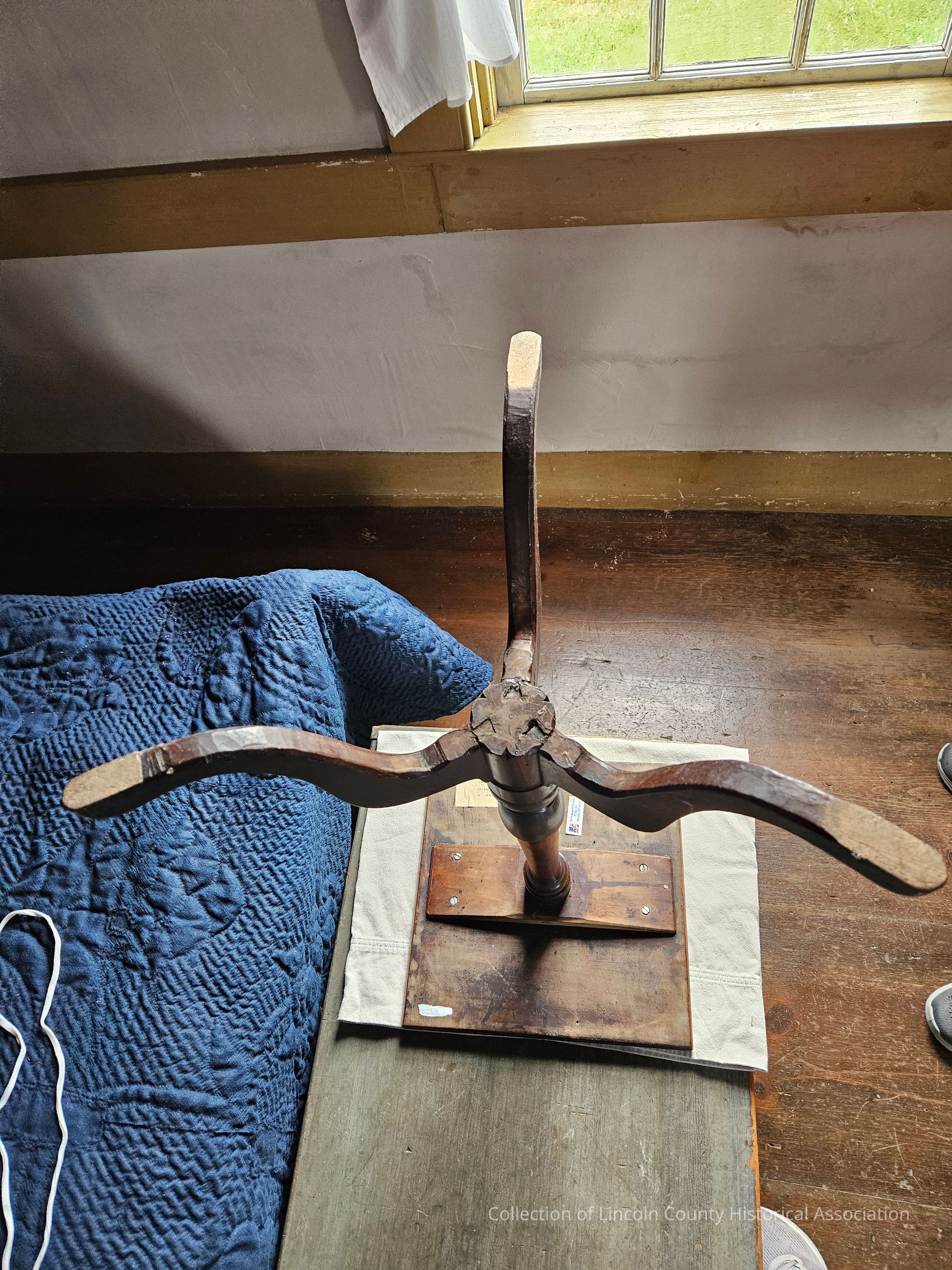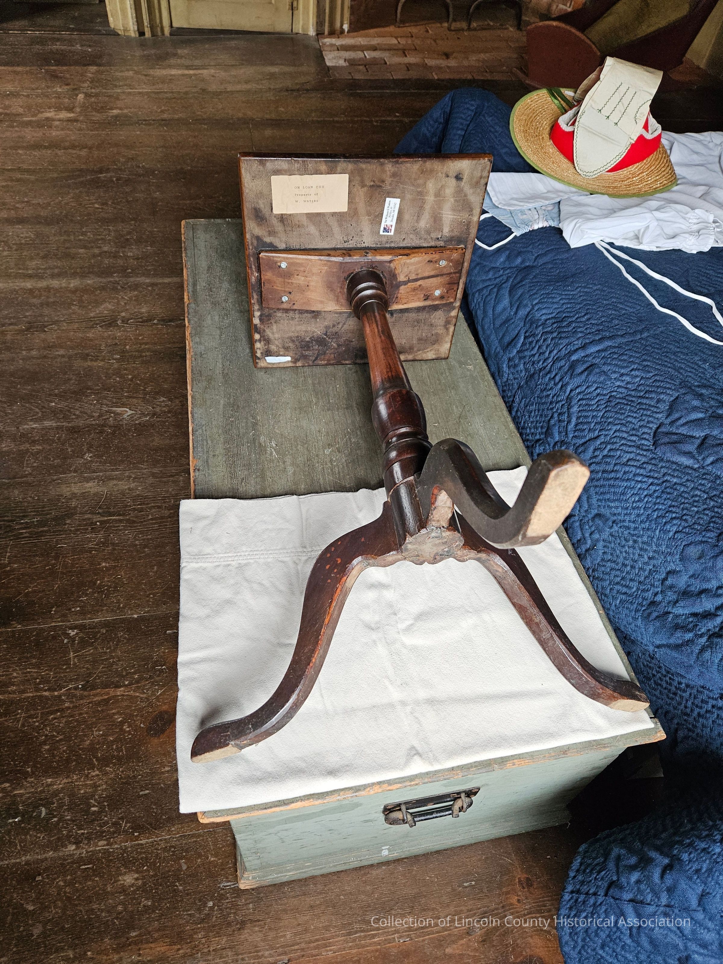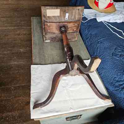 Rounded feet, same width as legs. Heavily stained dark brown finish. Mahogany with varnish finish. Damaged leg broken with loss on the shank just below the urn that has been repaired by regluing. Legs fitted into base of shank by dovetail grooving.Made/Created