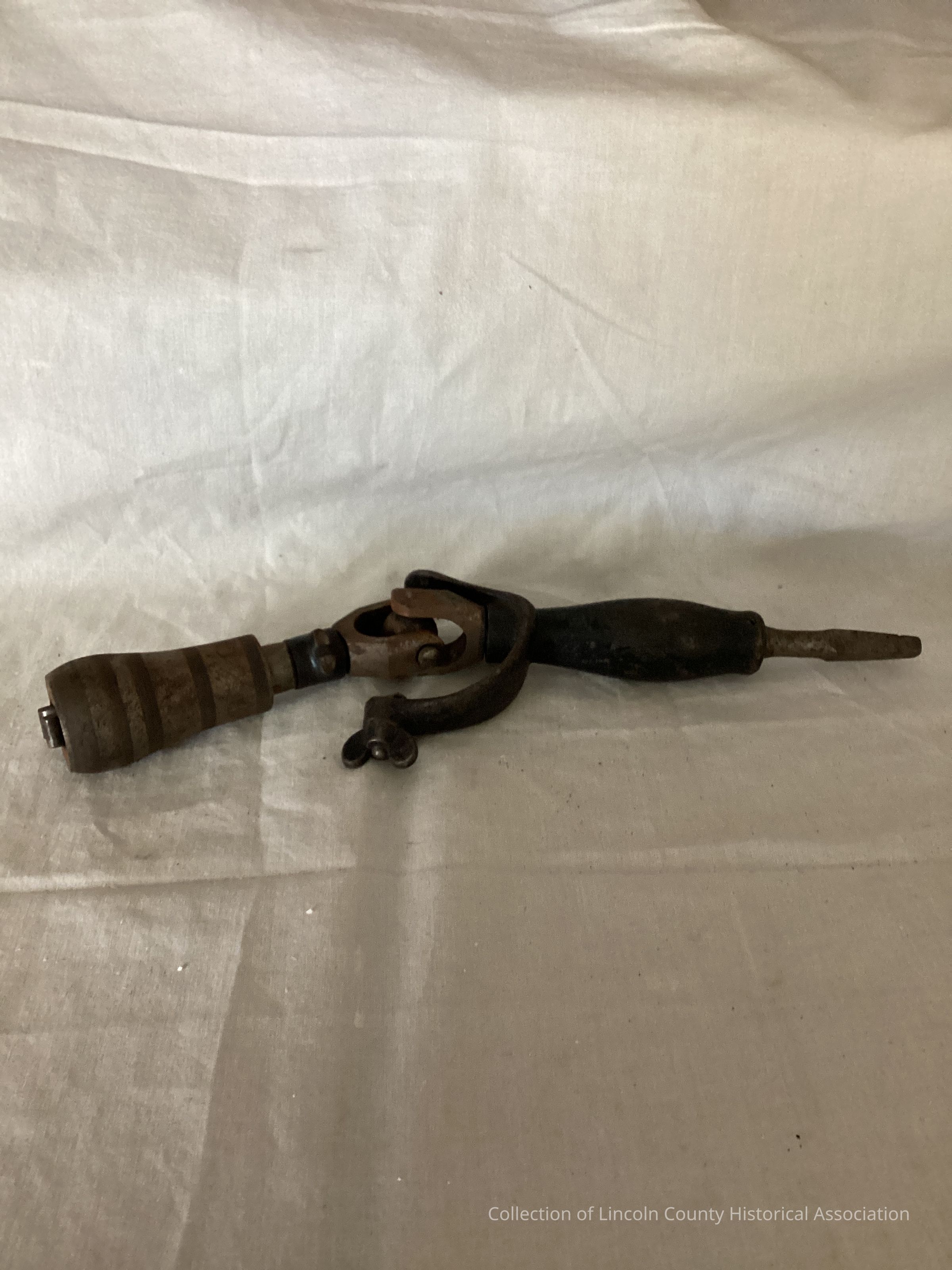 Cast iron and steel bit brace with a universal joint (articulated) chuck. Ball end socket arrangement than allows tool to fold and permit drilling from a corner.Made/Created