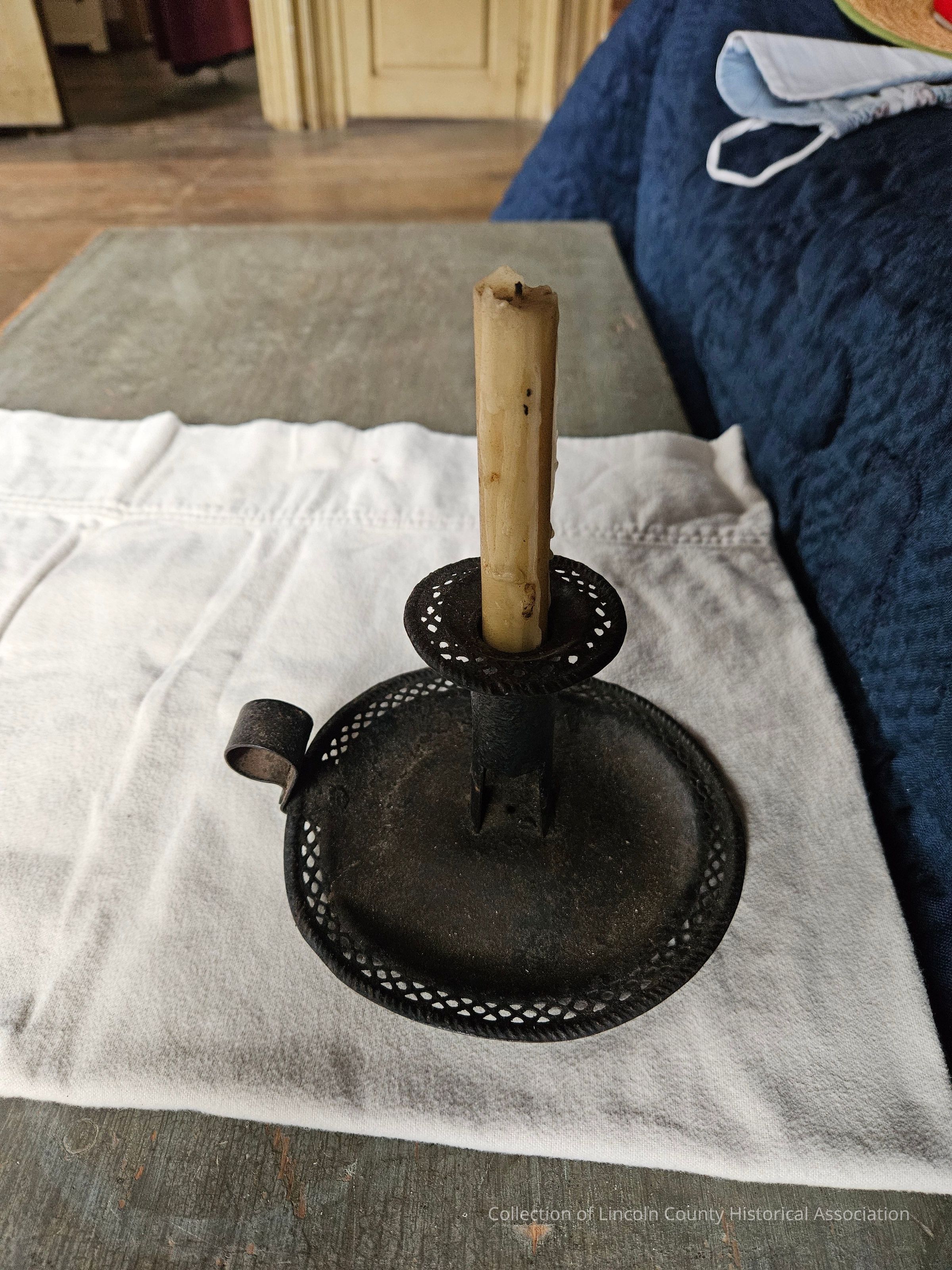 Candlestick with cut-out base and loop side handle. Saucer-like base with plain curved handle, vertical shaft holds candle topped by round drip edge. Drip edge and saucer base decorated with pierced open design of triangles bordered by delicate scroll edge printed black.Inscription/Signature/Marks