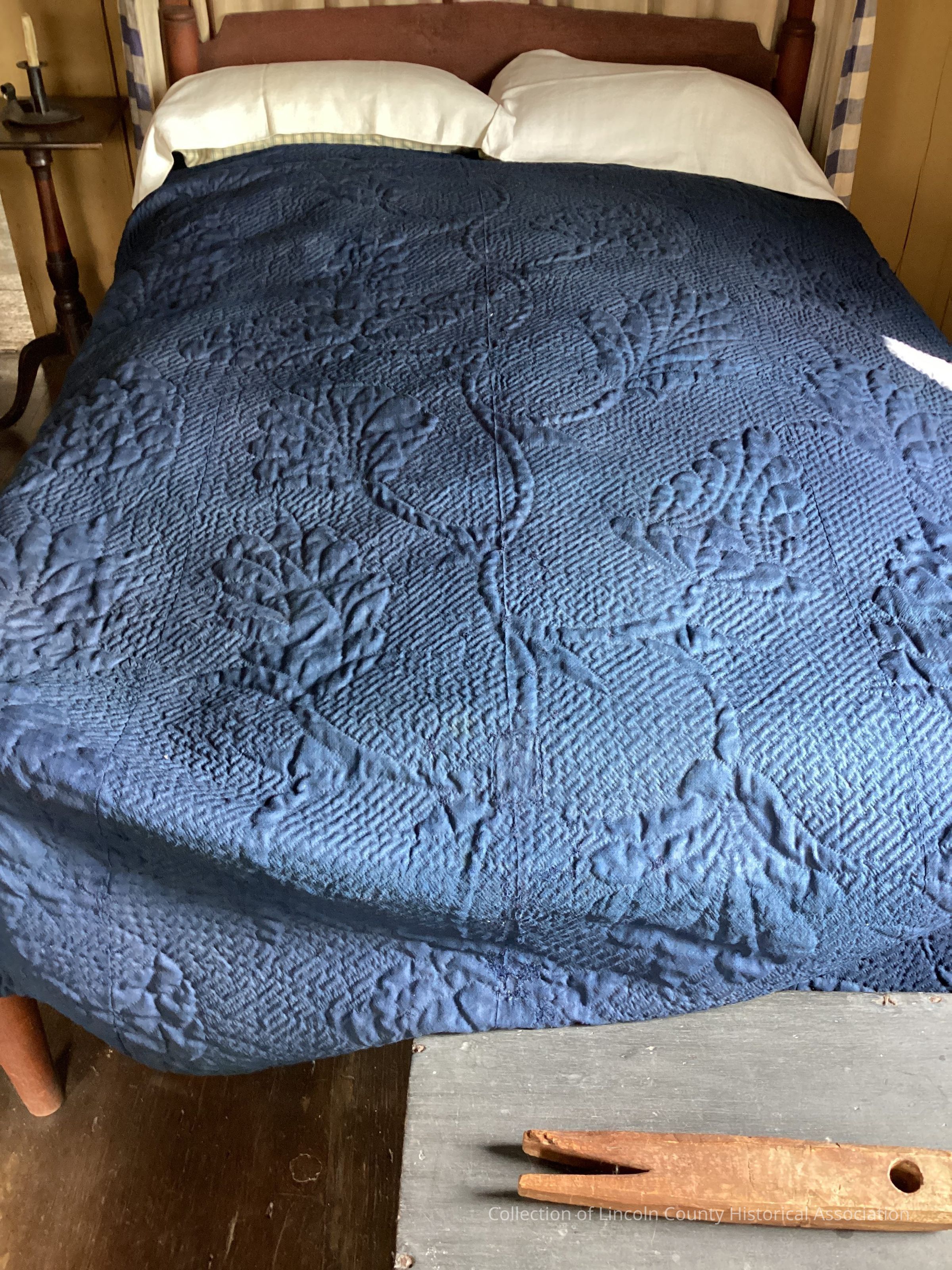 Linsey-woolsey bed quilt. Navy-blue with fruit and leaf design in quilting. Palm leaves on lower corners. Backing cotton fabric.