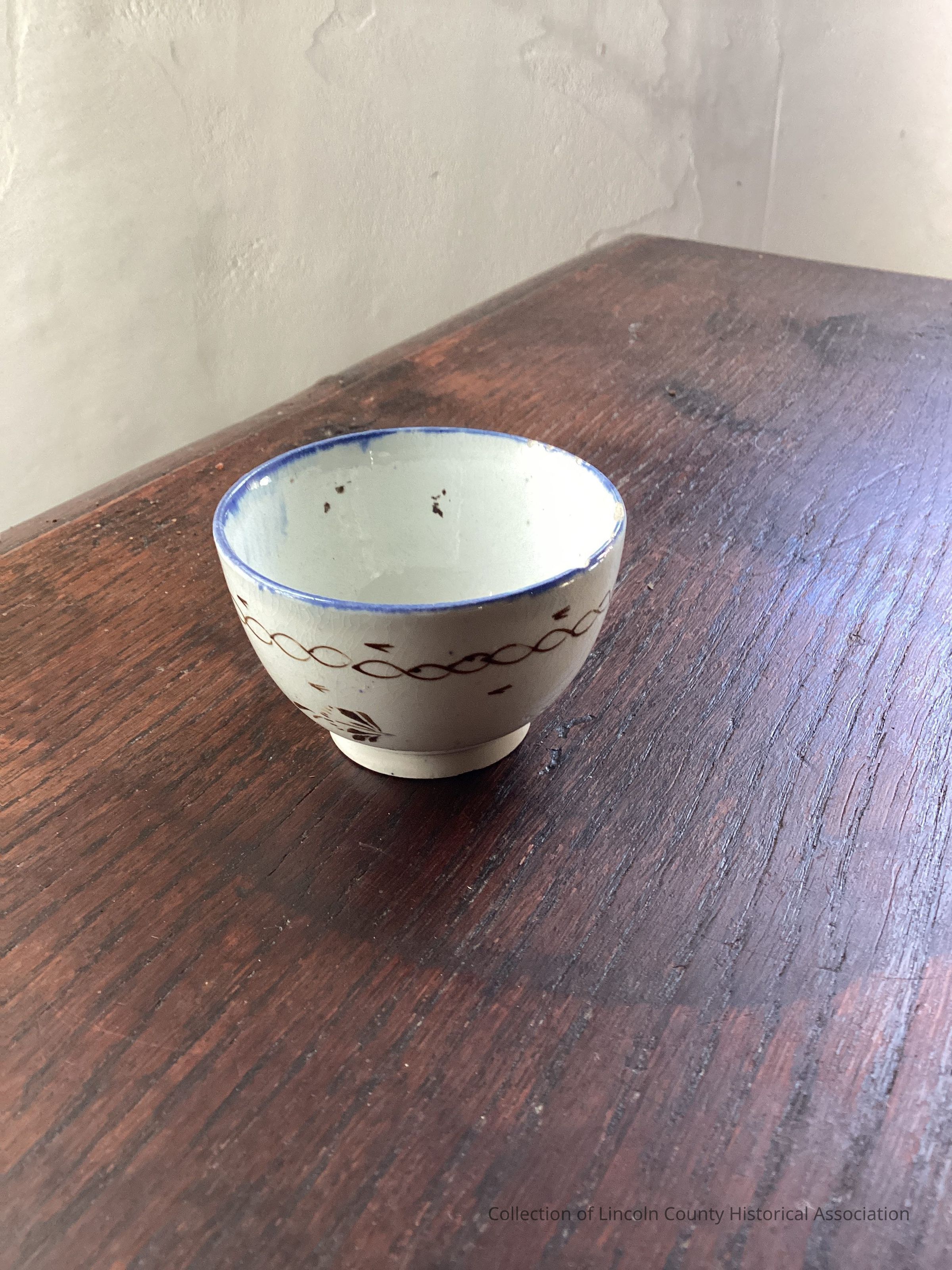One of a pair of small, hand painted, glazed bowls. Green and tan bud/leaf motif on a white ground below roping. Rim is blue.Dimensions