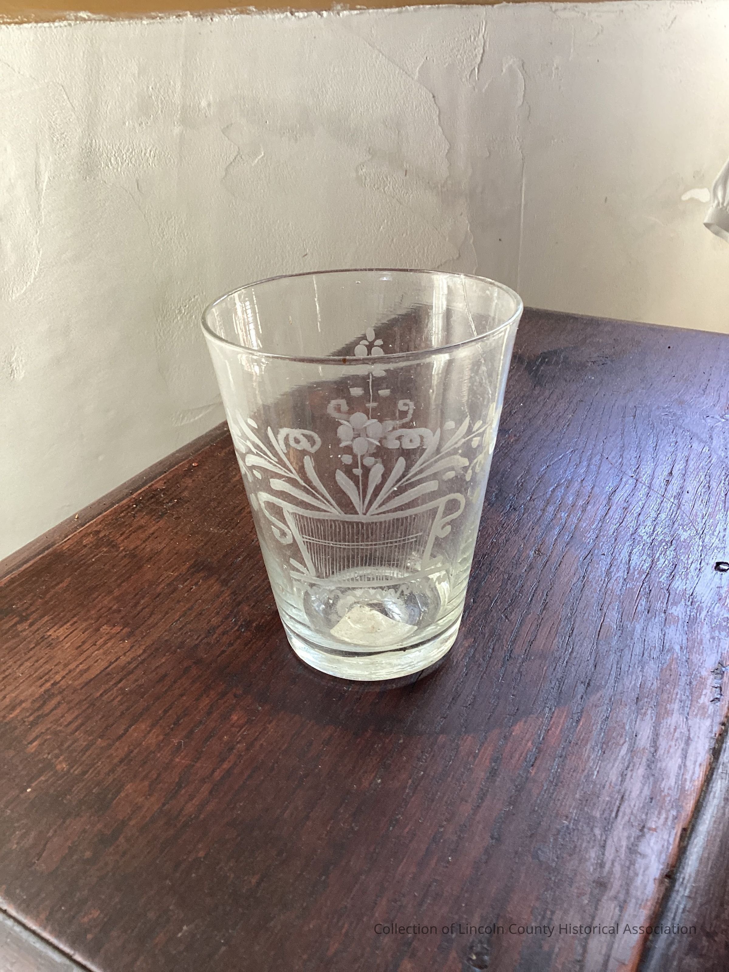Hand blown glass with central etched flowers in a basket and opposite a small floral motif