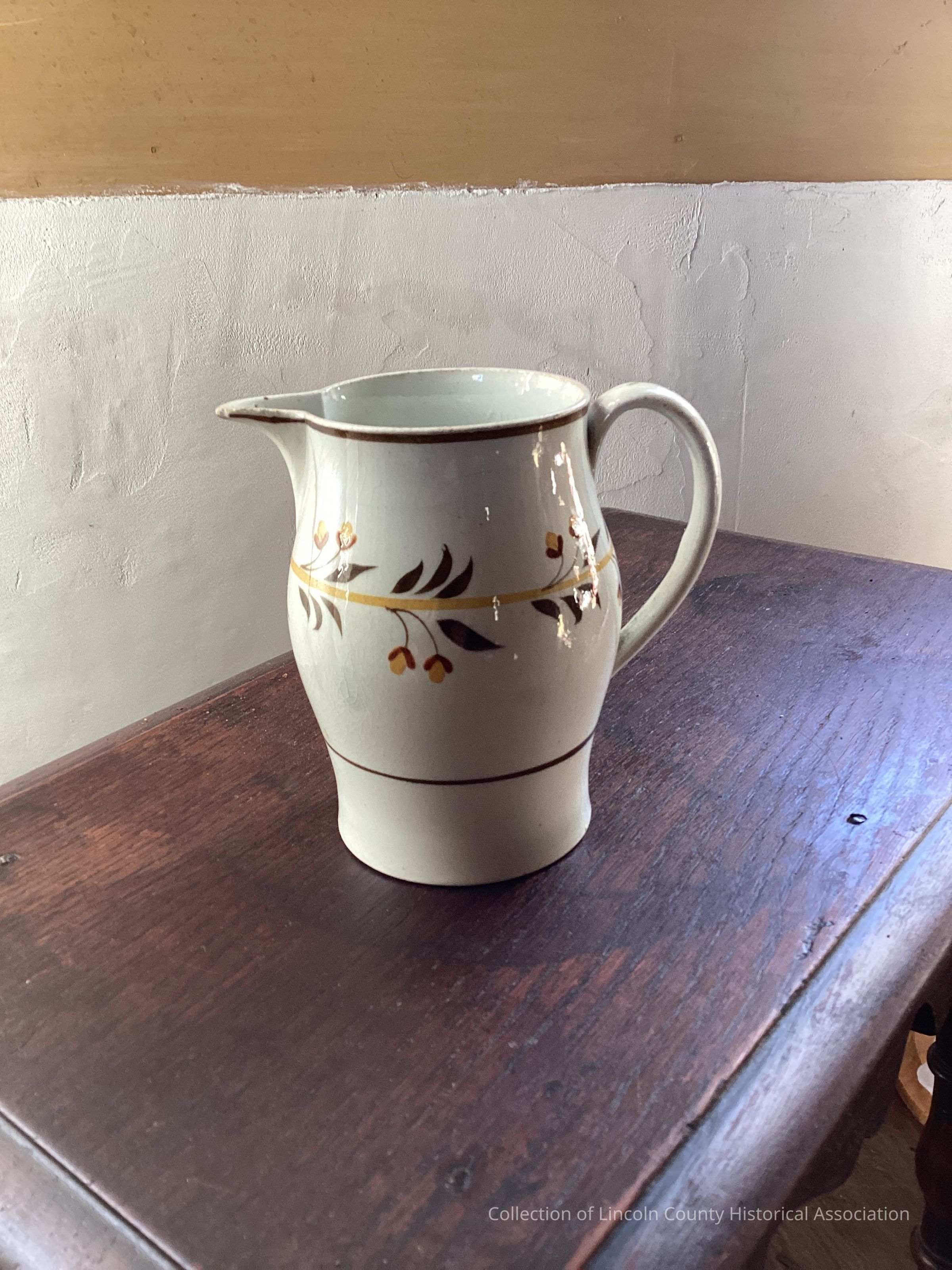 Medium sized pitcher with gold and tan blossoms with green leaf on a gold stem encircling the middle. Two thin brown bands at rim area.