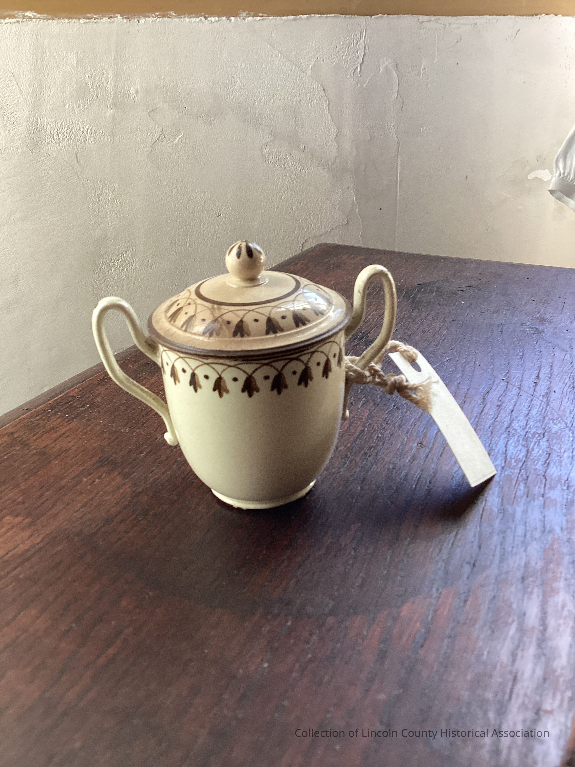 Ivory colored small bowl with upright handles. Reverse tulip (brown) suspended on fine apricot border below narrow brown band at rim. Fine line at base. Pattern repeated on lid with round shaped knob.