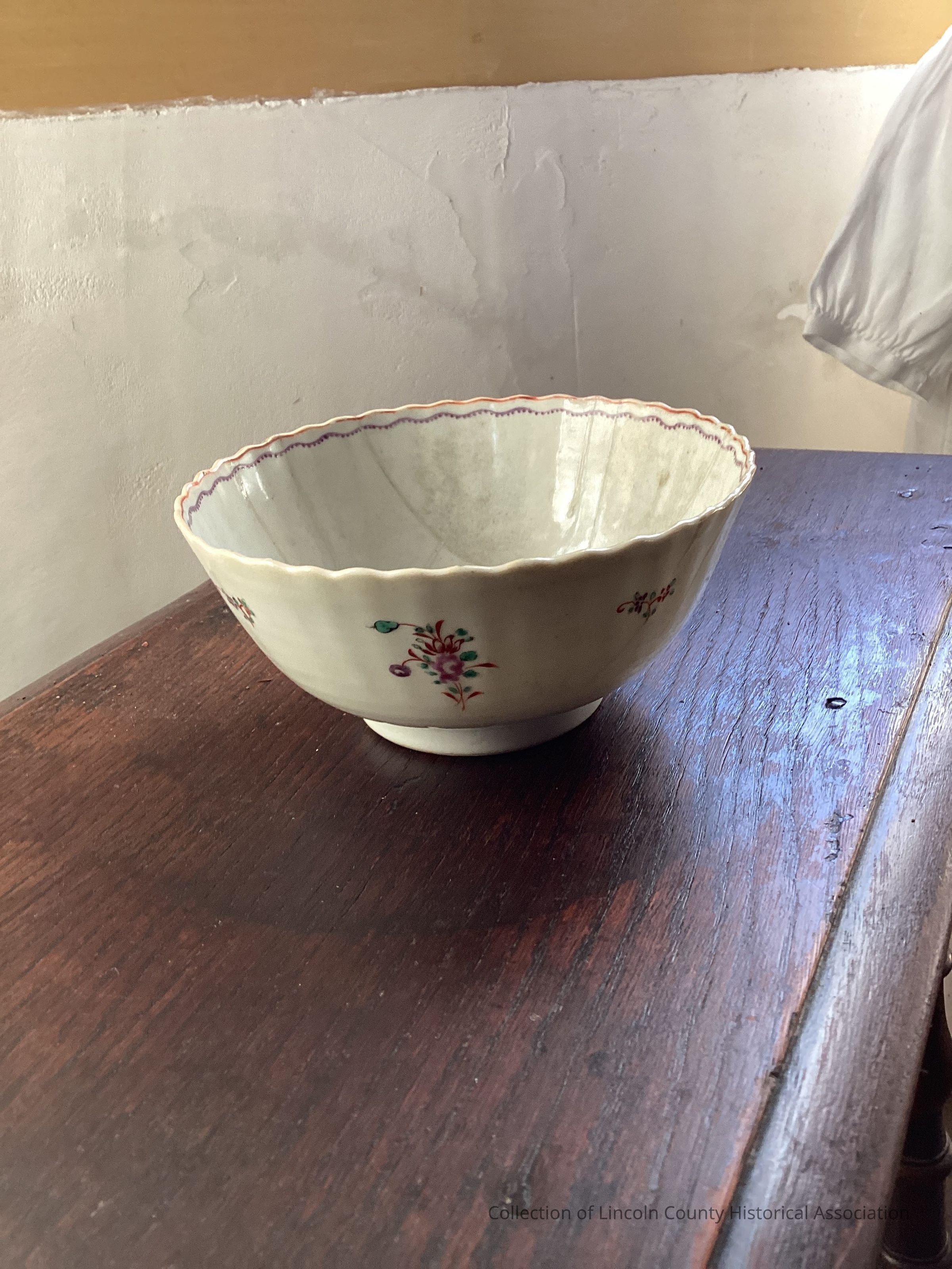 Medium bowl with slightly fluted body. Delicate rose/mauve/rust floral motif with green leaves encircle the exterior. Delicate undulating rust red line above a dotted chain inside rim.Inscription/Signature/Marks