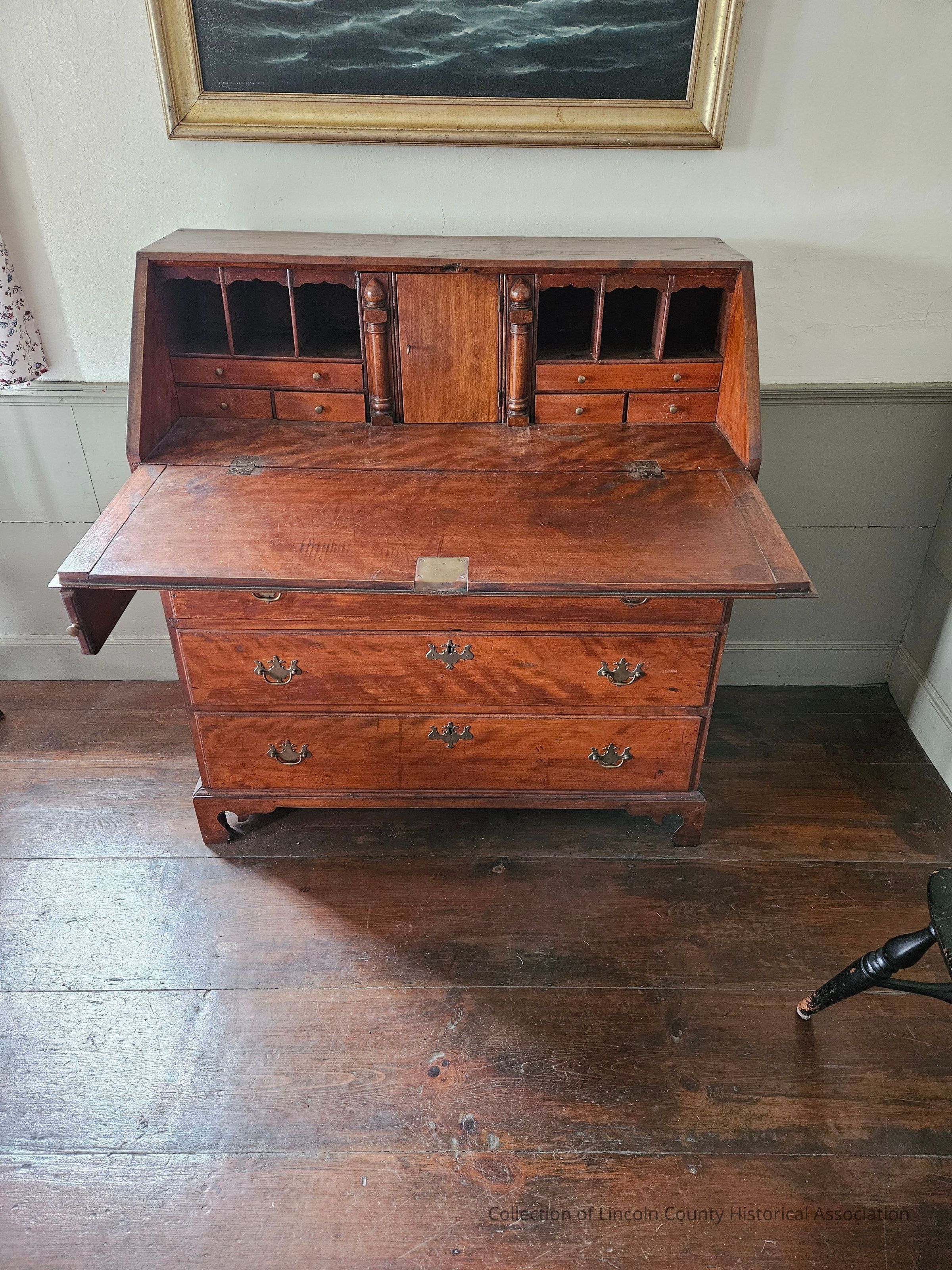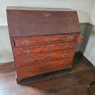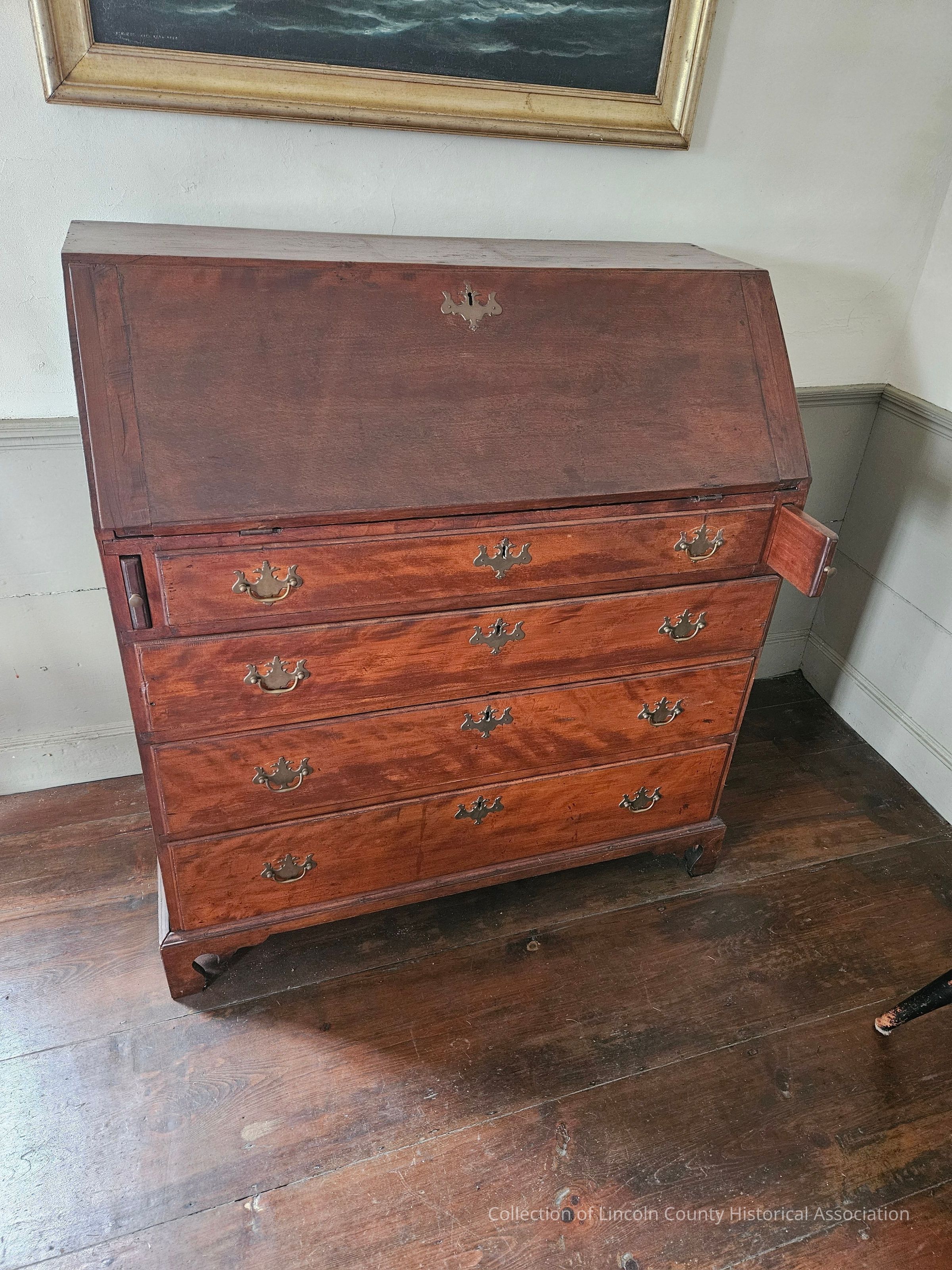 Slant-top desk resting on decorative scroll feet ("bracket feet").Made of hard maple with basswood as the secondary wood. Interior has central cupboard drawer. Chippendale brass pulls on 3 drawers - each drawer has 2 pulls and one key escutcheon.