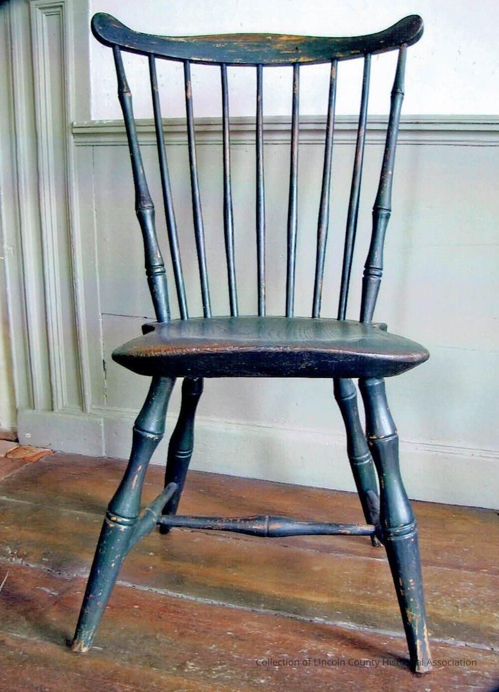 Fan-Back Windsor Side Chair in "bamboo style" with seven spindles. Spindles slightly swollen at middle. Fan back chair rail supported by two turned outer balusters. Solid seat above four turned legs - two side stretchers connected by one stretcher. Chair rail is red maple. Shaped seat is white pine. Legs and stretchers are boldly turned and all with cylindrical grooving at pronounced swelling. Painted black. Doweling of the legs into the seat does not extend fully through the seat. Seat shaped with outward curve at back and with a pronounced outward curve to the front which is also rounded towards the center. The back of the seat has an indented curved line accentuating its shape.Made/Created