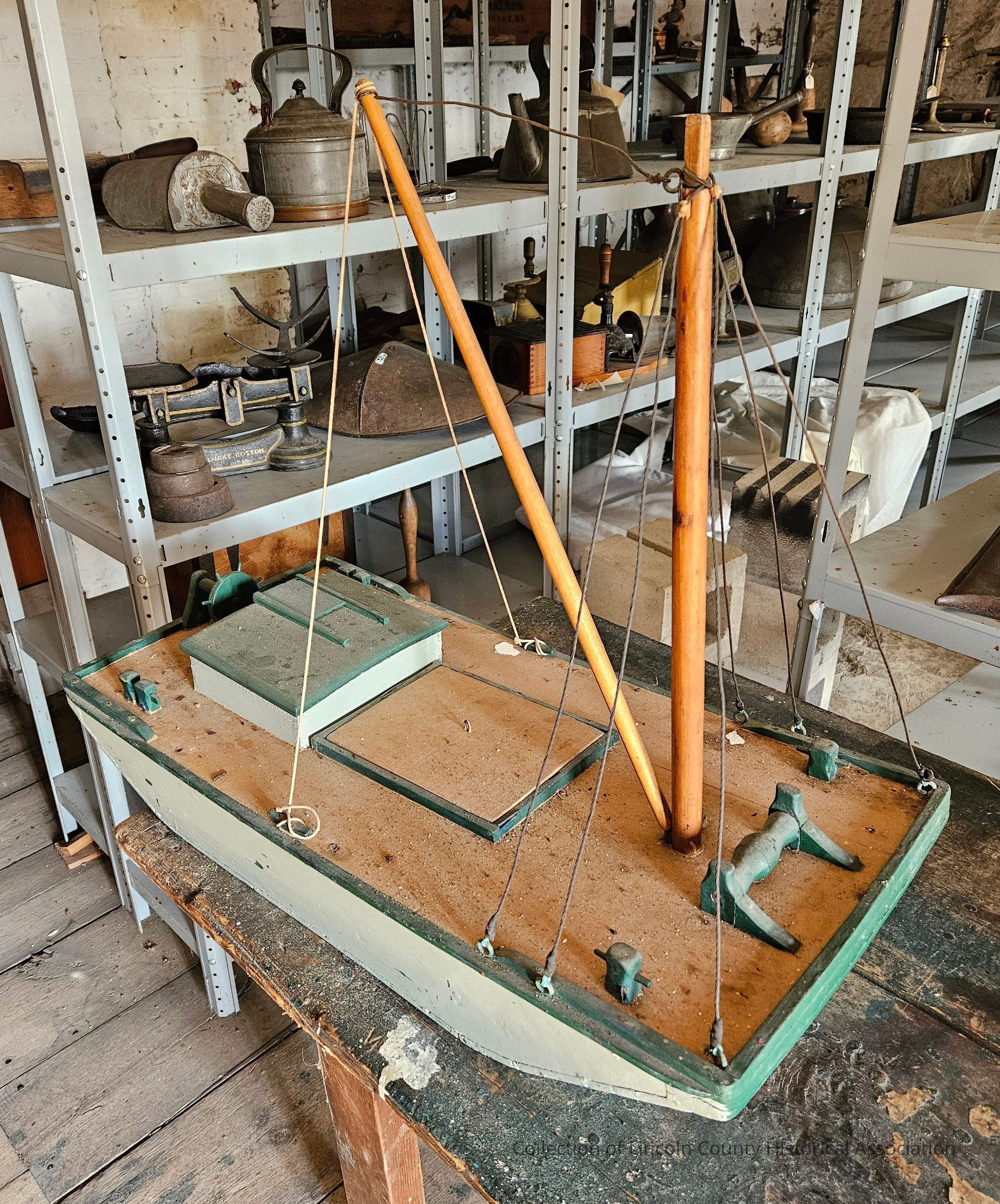 Wooden model ship. Large and bottom is blue and green in color. Two masts. Captain Jones's scow was named the "North Star." Is a model of the Scow owned and operated by Captain Jones on the Sheepscot River. He lived in Sheepscot village on the King's Highway.Made/Created
