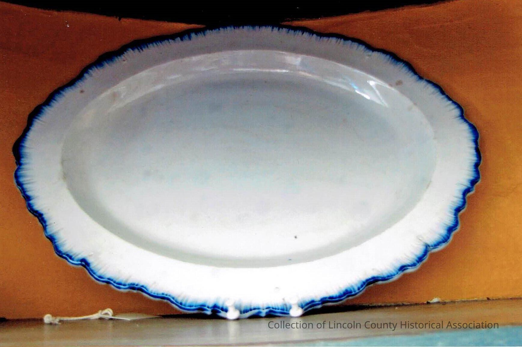 Oval off-white platter. Scalloped, feathered blue rim. Leedsware.Made/Created