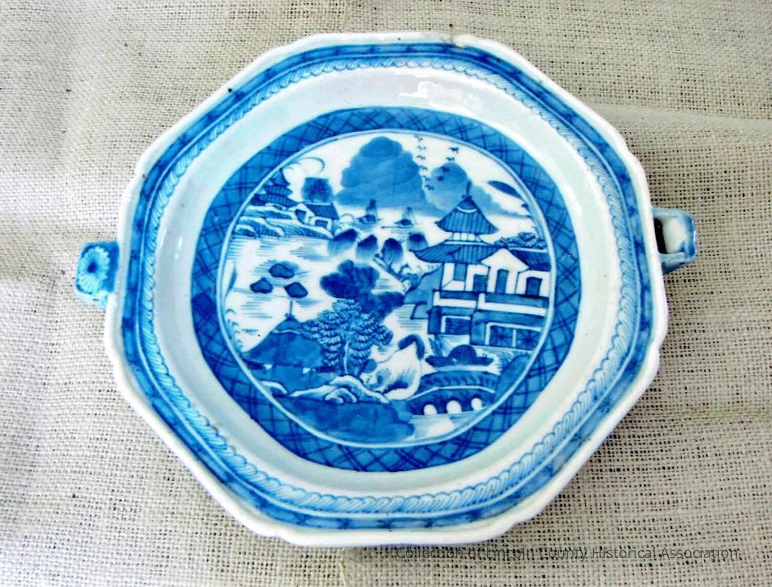Octagonal warming dish One handle acts as spout. Cantonware - 1790-1800. White china, blue decoration of Asian river scene.