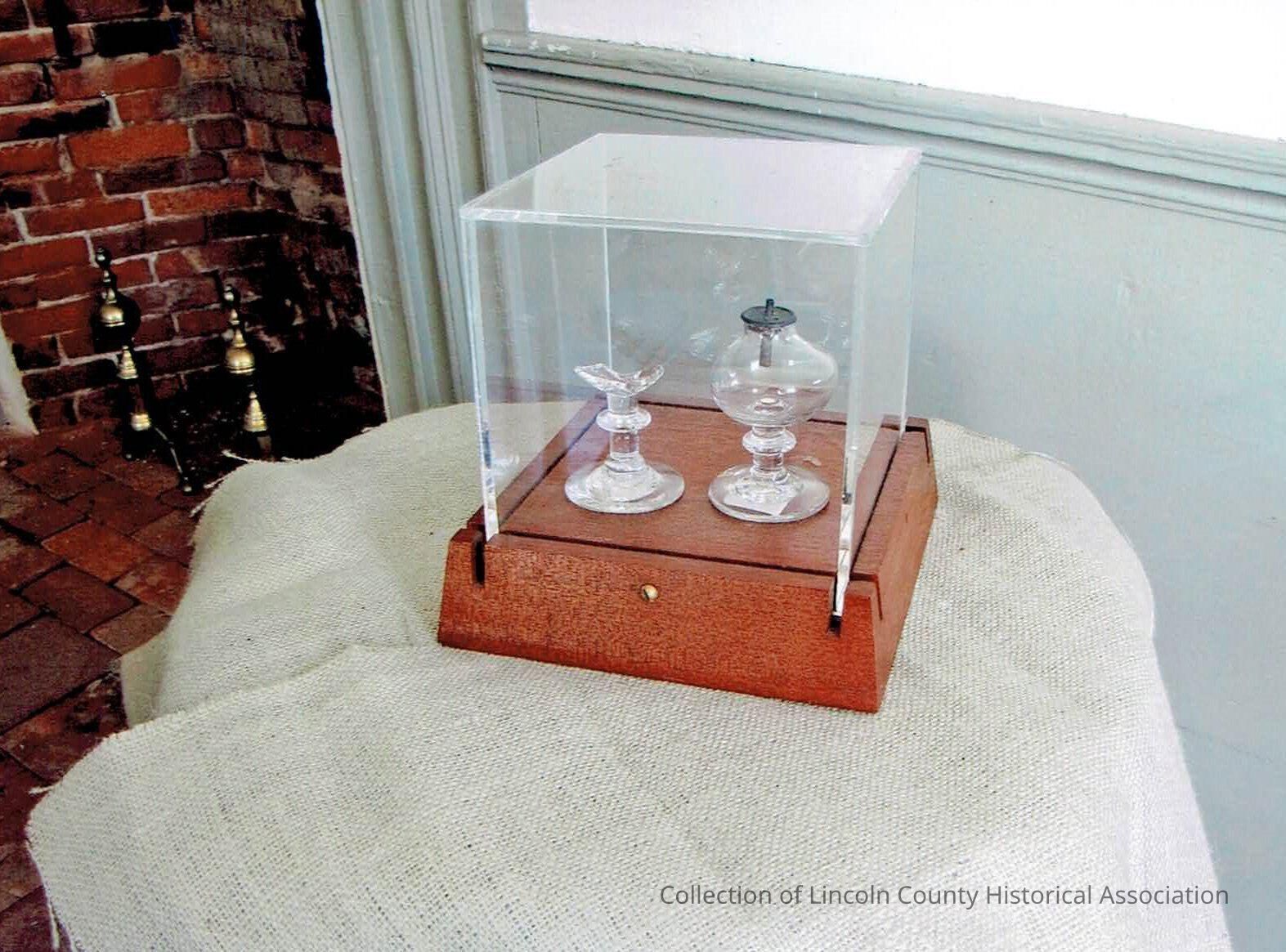Lower portion of small lamp. Round base, short simple stem, broken top. Small lamp on stem base. Metal cap with tube. Both in display case.Inscription/Signature/Marks