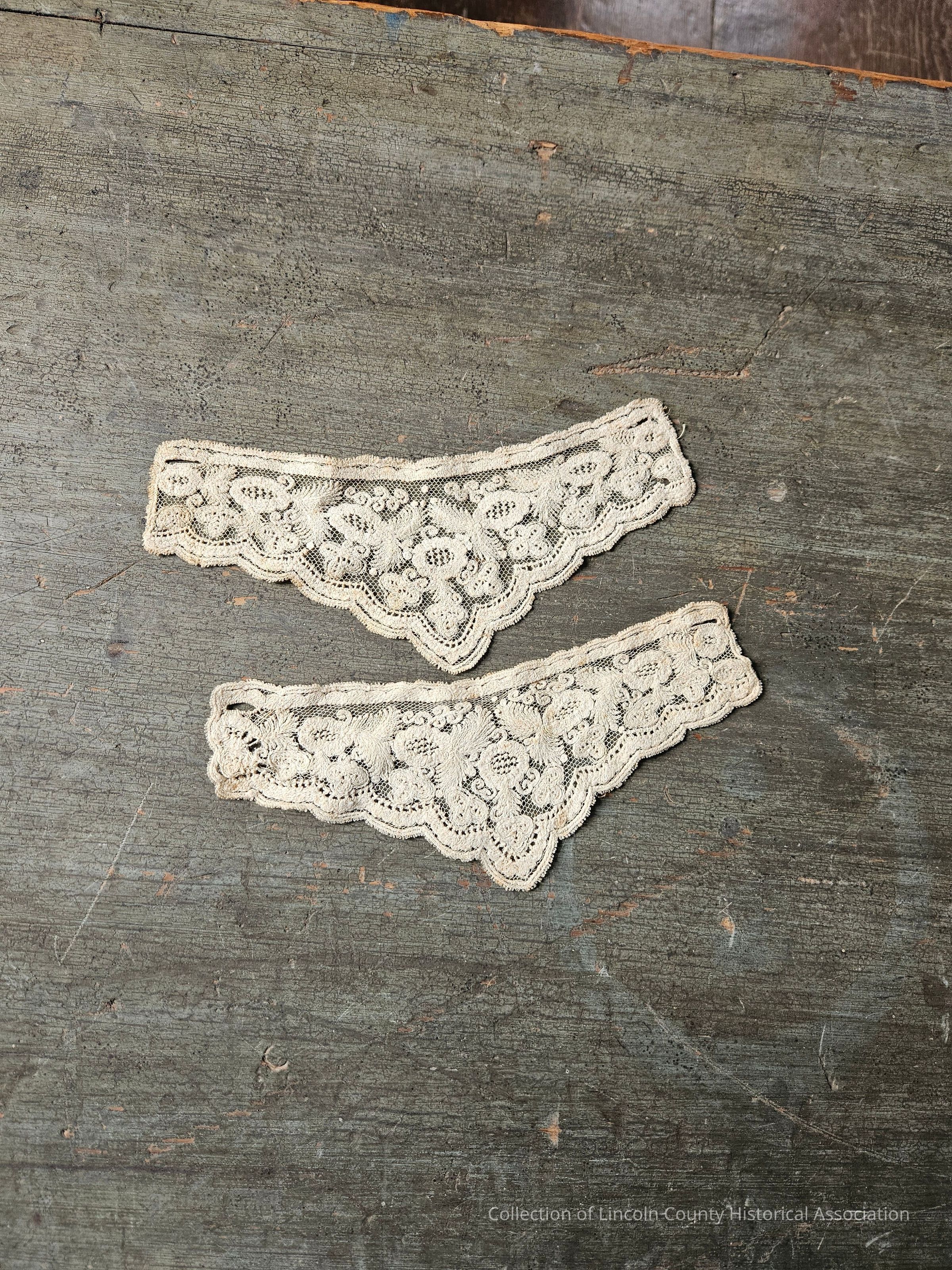 Pair of lace cuffs. Scalloped edges and leaf design in center. Triangular in shape.