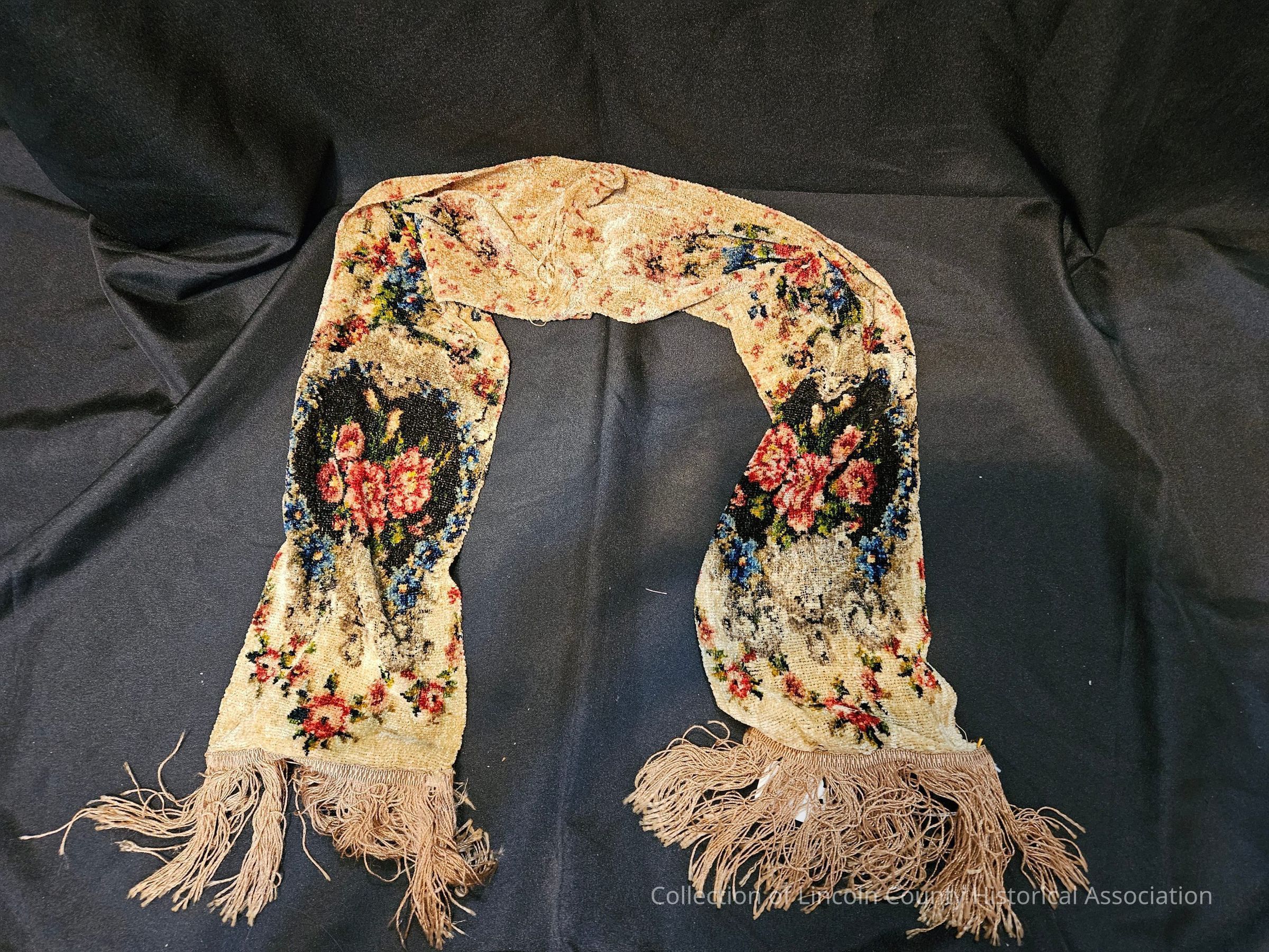 Tan scarf with floral designs. Two pieces of fabric were clearly stitched together to create this scarf, seam protrudes at back of the neck. Tassels hanging off ends of scarf.Clothing/Dress/Costume Details