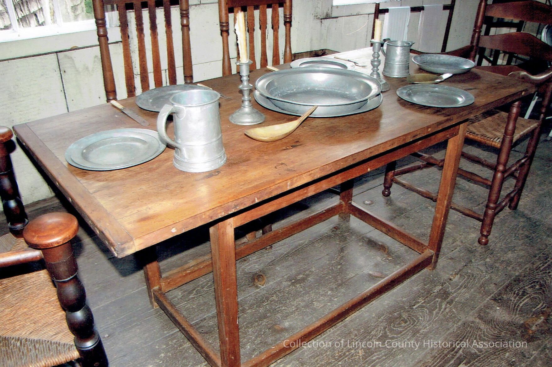 Single board top table with narrow boards finishing each end. Plain stretchers between simple legs. Four rectangular holes on sides which indicate side leaves.