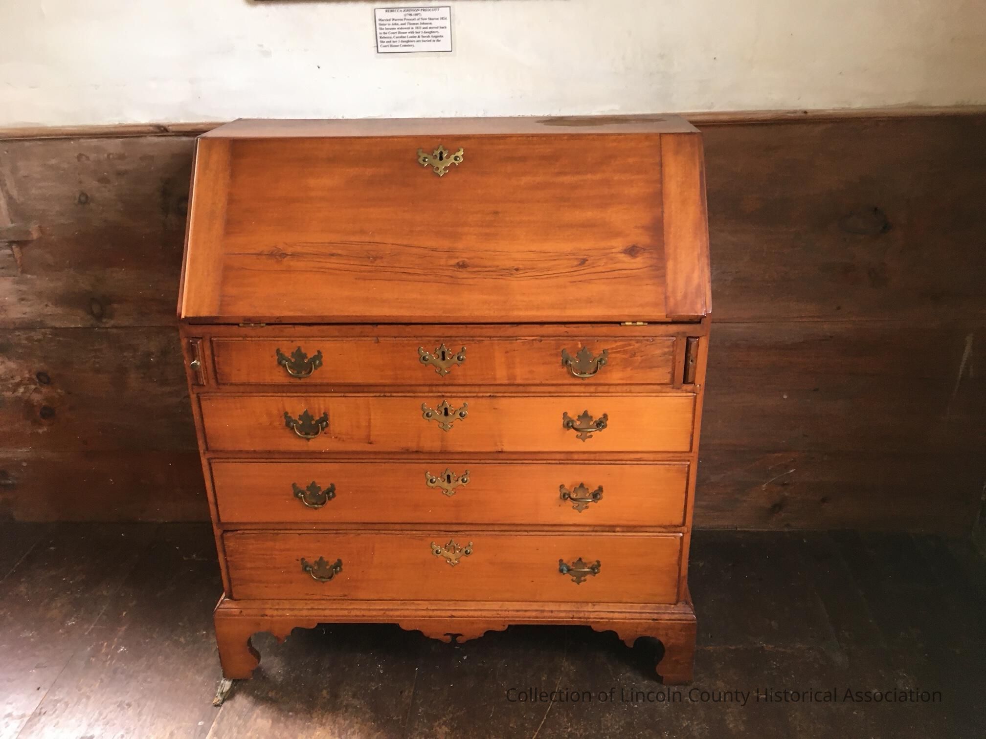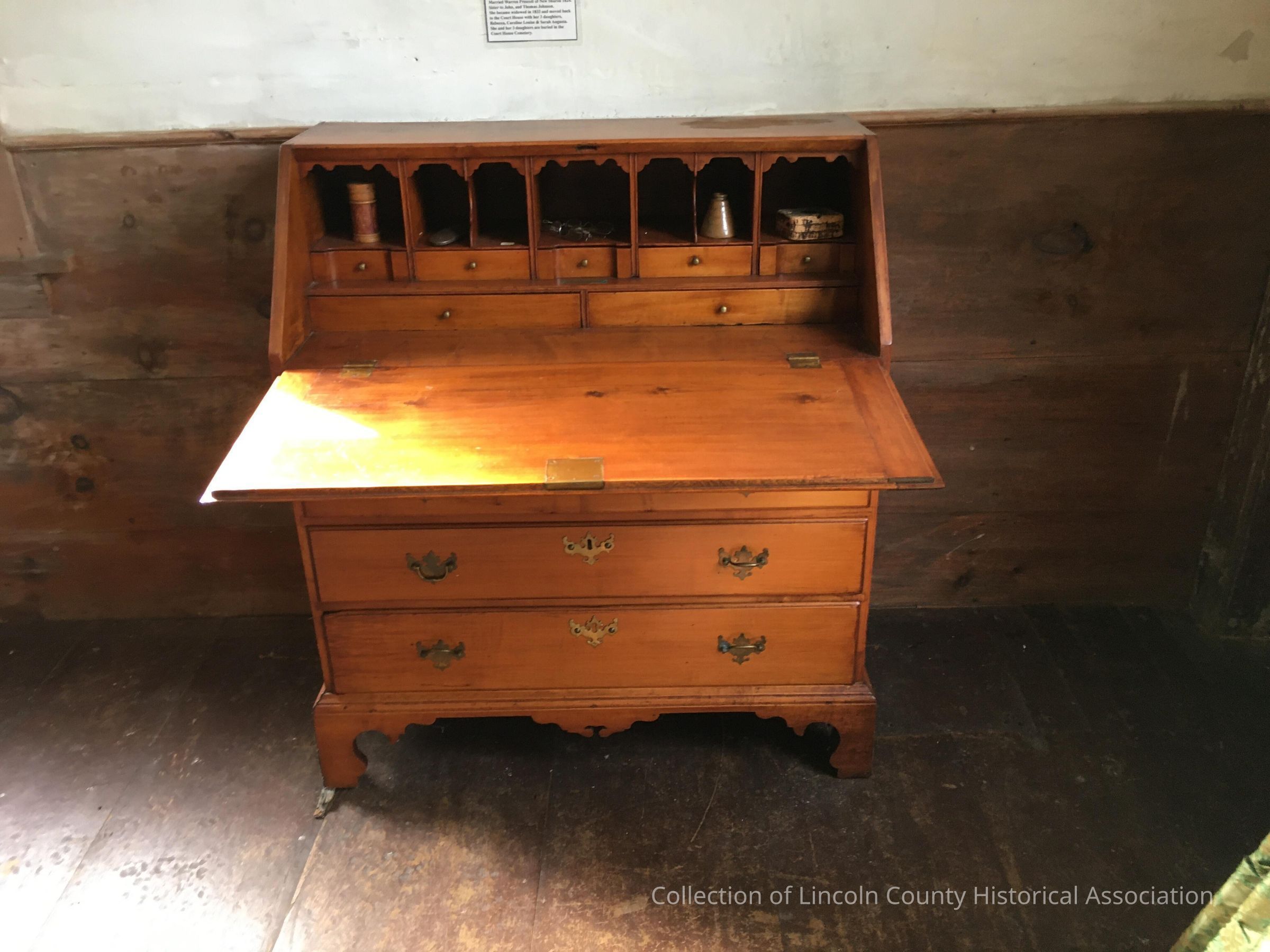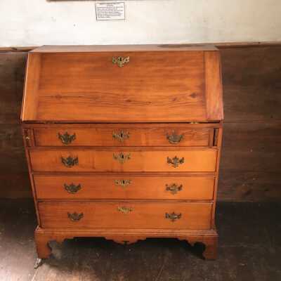 Maple Slant-top Desk on straight bracket feet. Interior with two tiers of drawers and seven cubby holes of which the center one has a blocked drawer.