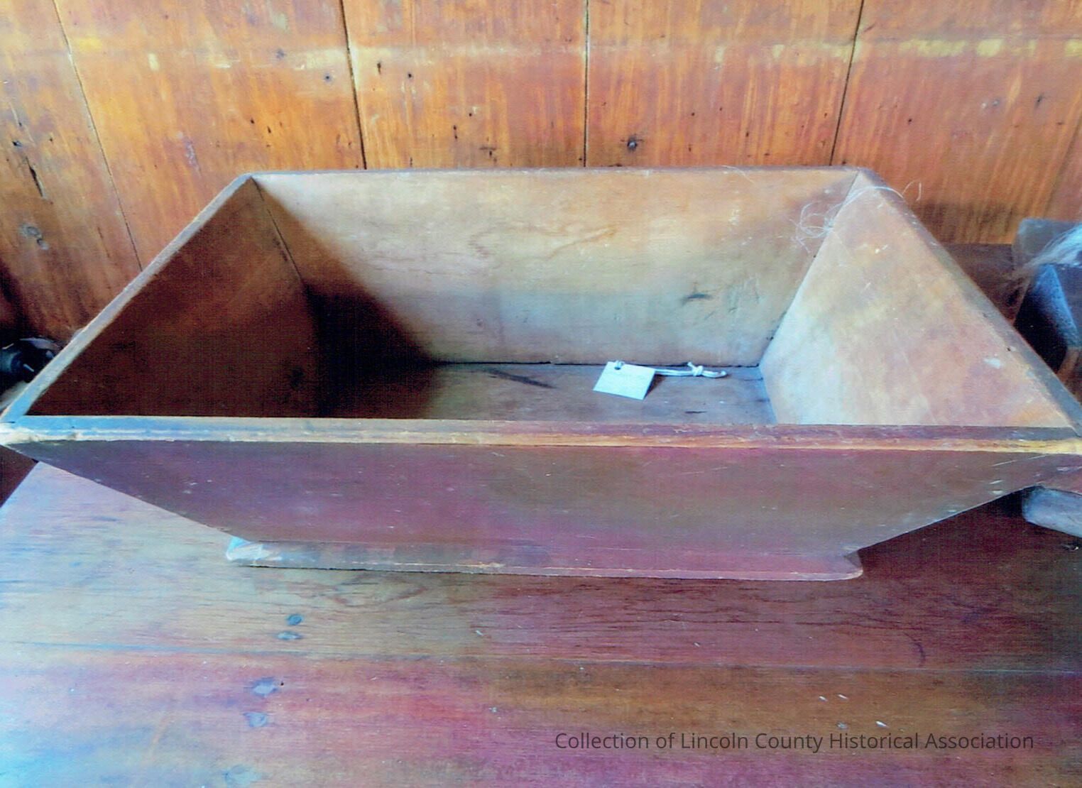 Pine dough trough stained red on outside. Simple angled baseDimensions