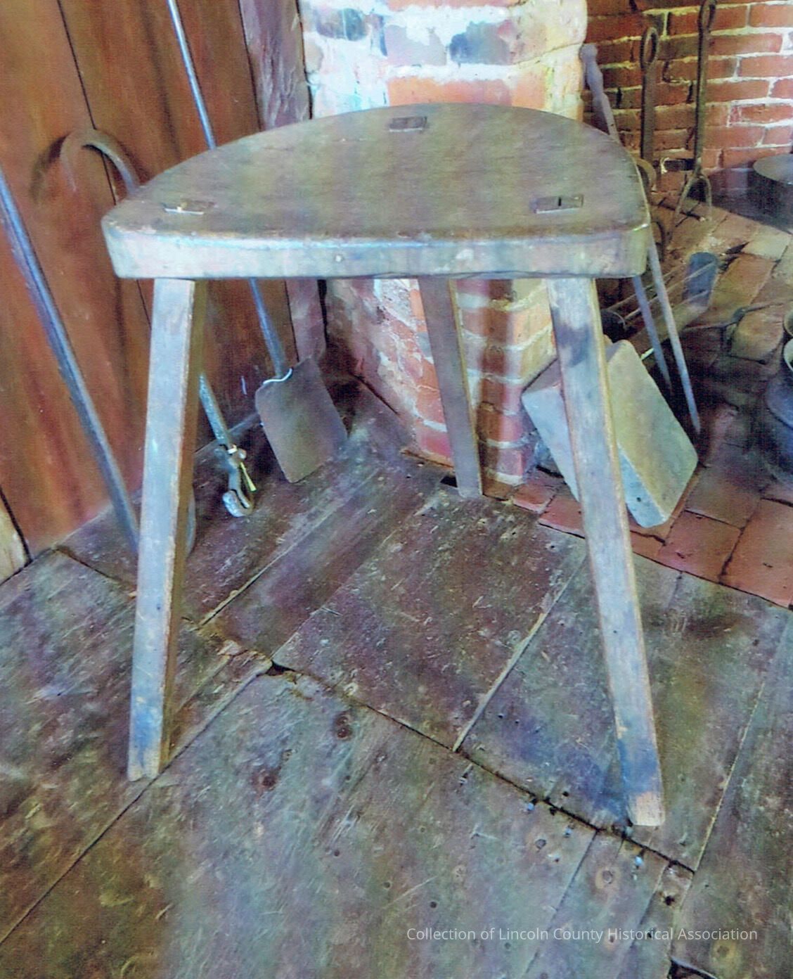 Tilted seat stool with three splayed legs. Possible weaver's stool. Worn staining or coating - possibly yellow