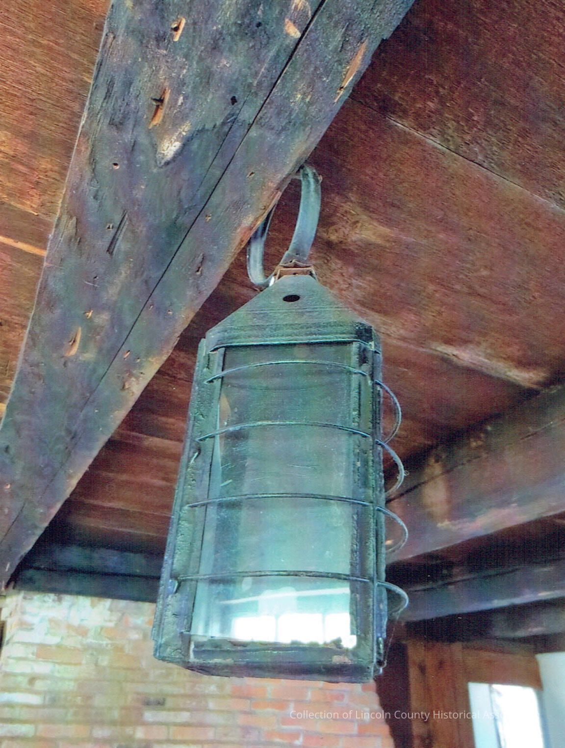 Rectangular painted metal lantern with four heavy gauge wire on three faces protecting glass. Pyramidal-shaped top with circular metal ring hanging device.