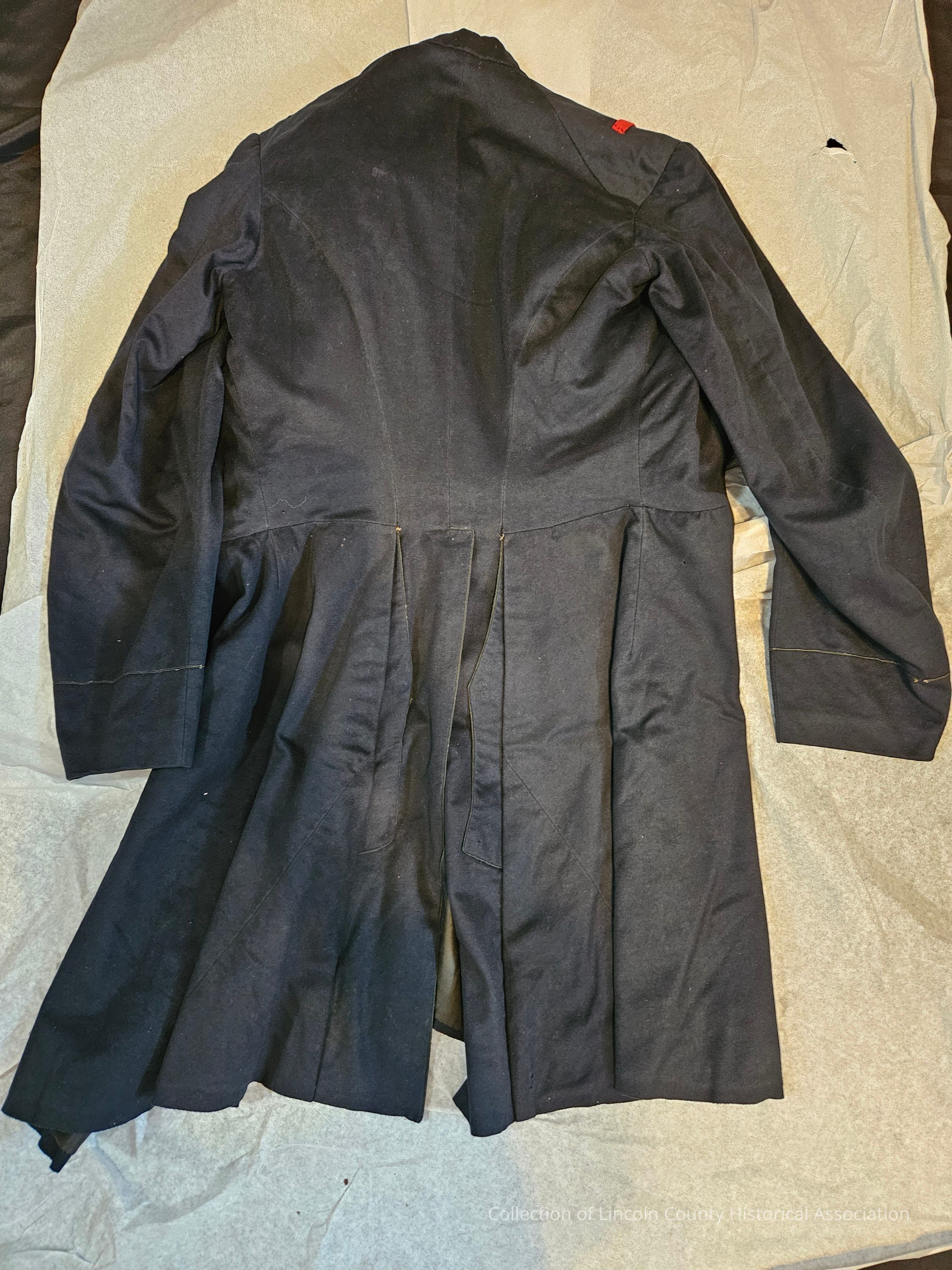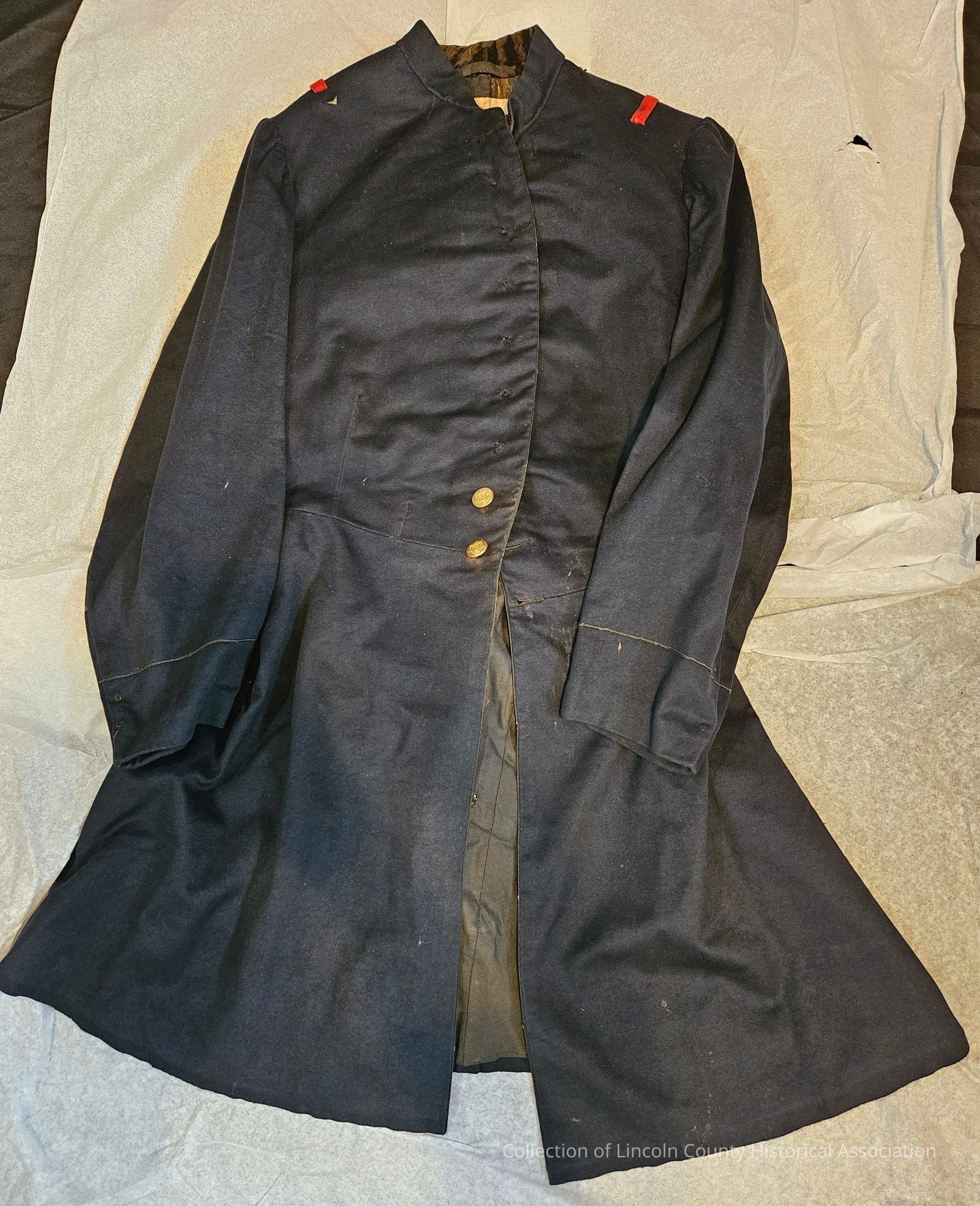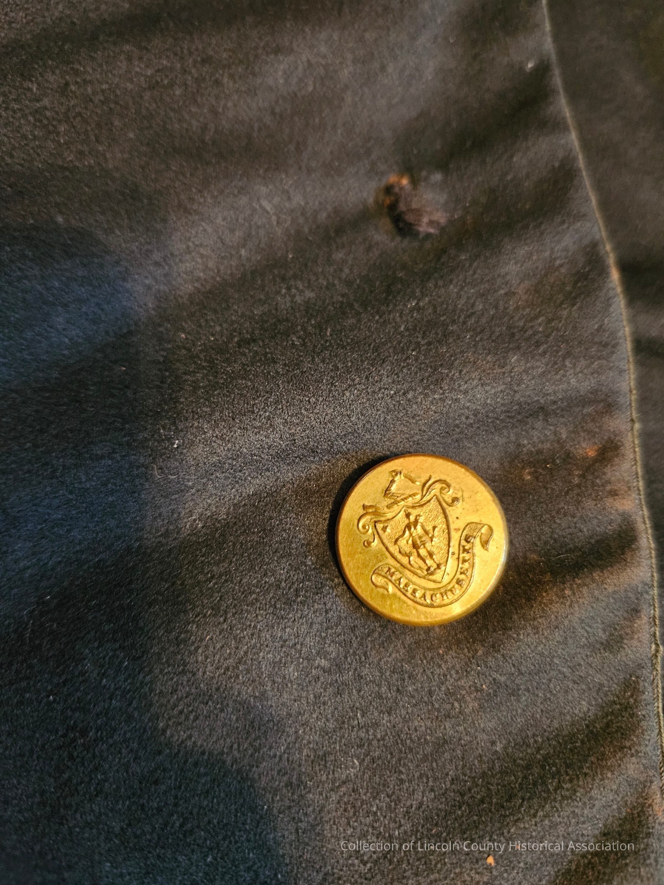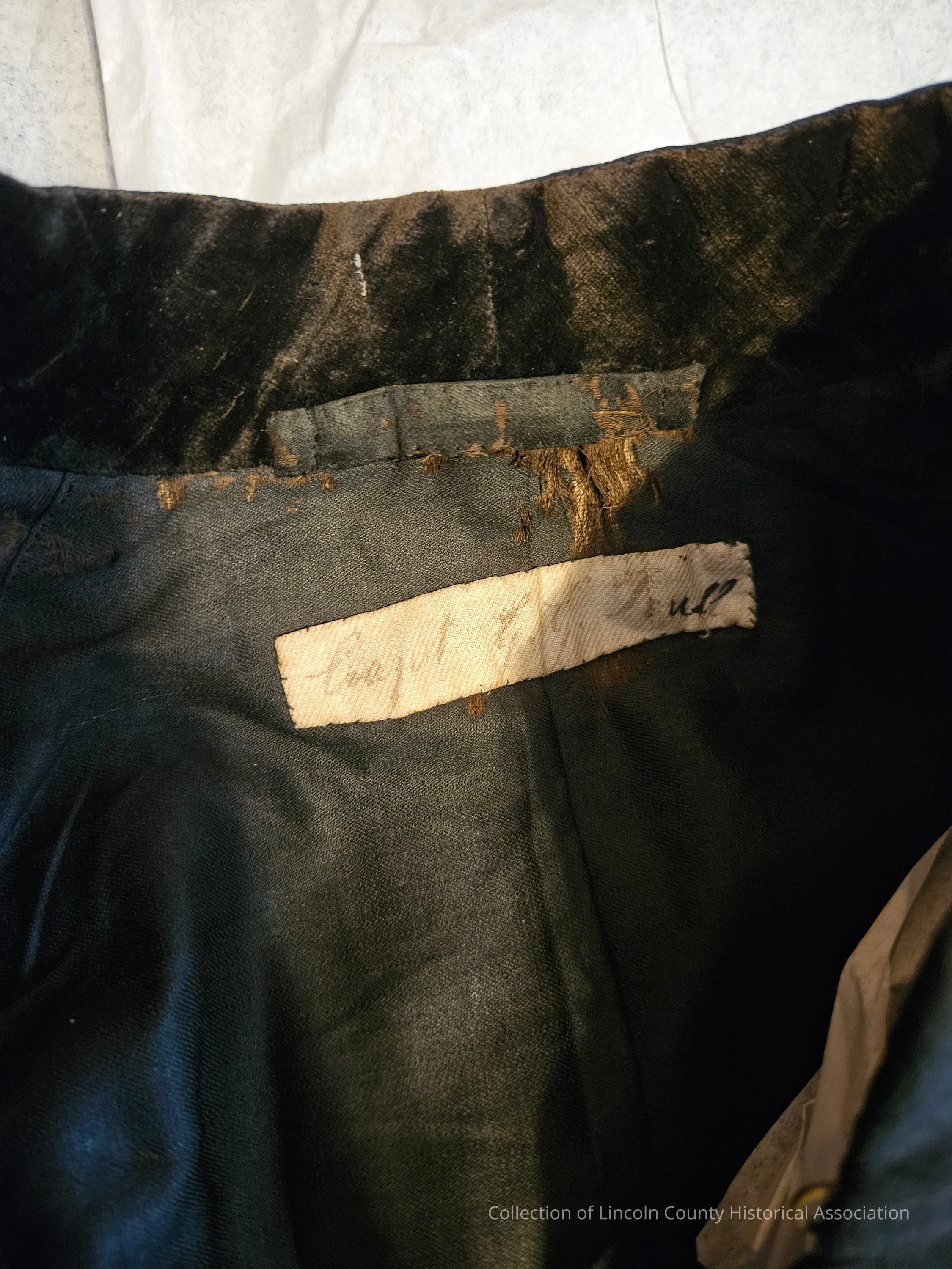 Blue wool Civil War uniform coat worn by Capt. George G. Trull. One red fabric stripe on each shoulder. Nine button holes on the front, two extant buttons. Buttons say "Massachusetts" on them and have the state seal as well. Velvet collar. Black cotton lining around most of the inside, white lining on sleeves. Leather belt around inside waist. Label with "Capt. G. G. Trull" written on it sewn into inside collar. George Trull joined the Second Massachusetts Battery of Light Artillery on July 31st, 1861 as a second lieutenant. On December 18, 1861, he became a first lieutenant. On October 21, 1862 he transferred to the Fourth Massachusetts Battery of Light Artillery and promoted to captain. He mustered out in October 1865.Clothing/Dress/Costume Details