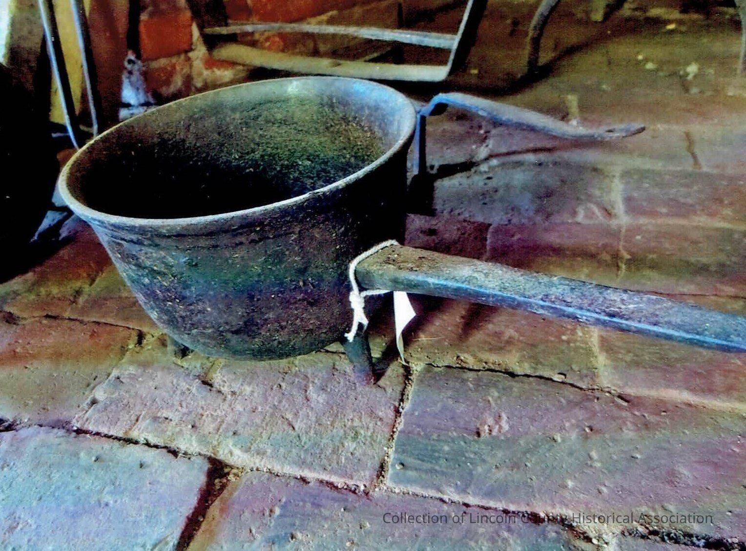 Round pot, supported by three tapered legs. Rigid handle on side, tapered. Possible colonial revival reproductionInscription/Signature/Marks