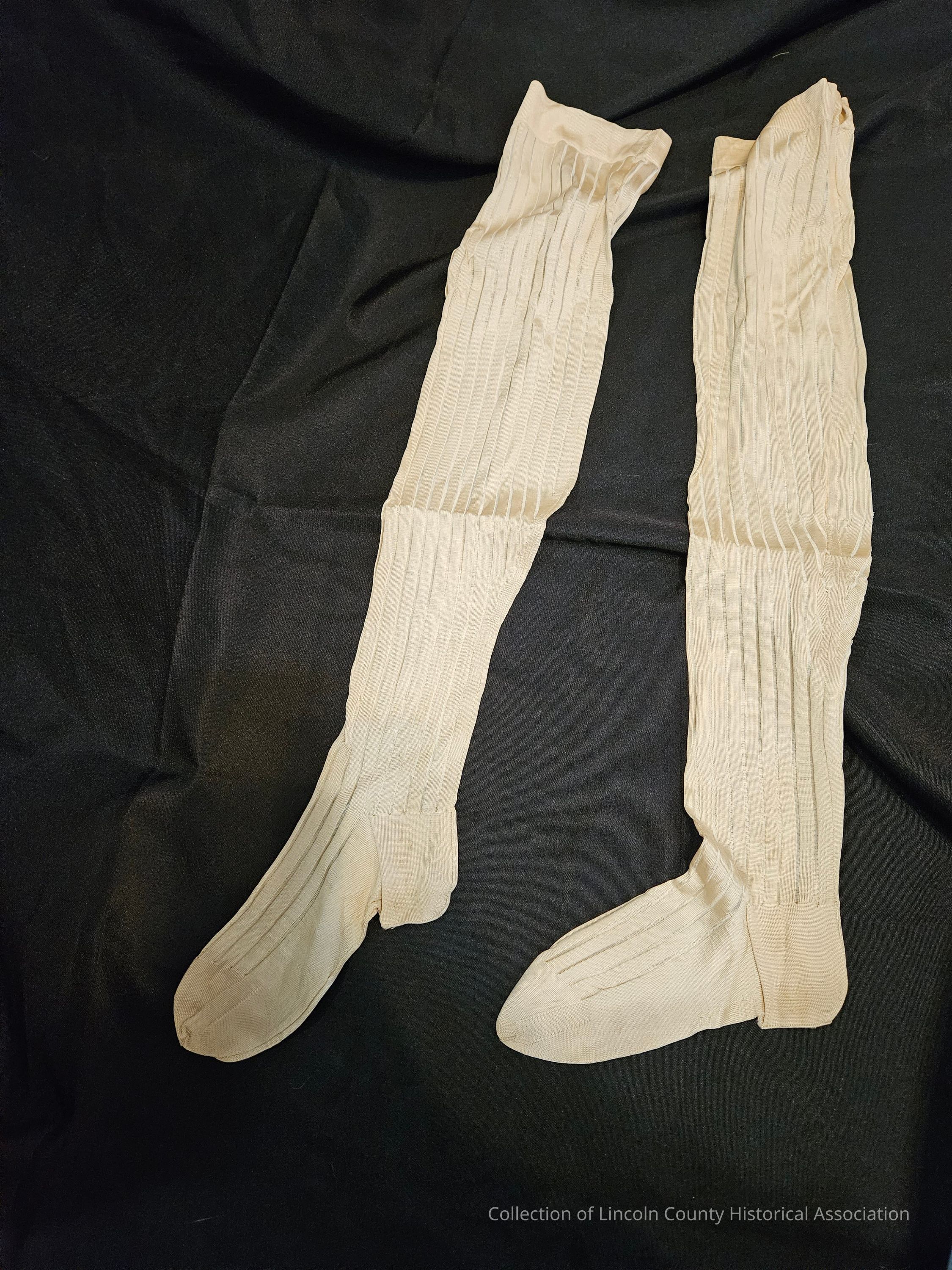 Pair of beige ribbed silk stockings. Bottom of foot and top of sock are of a thicker fabric than the rest of sock. Knee length.Clothing/Dress/Costume Details