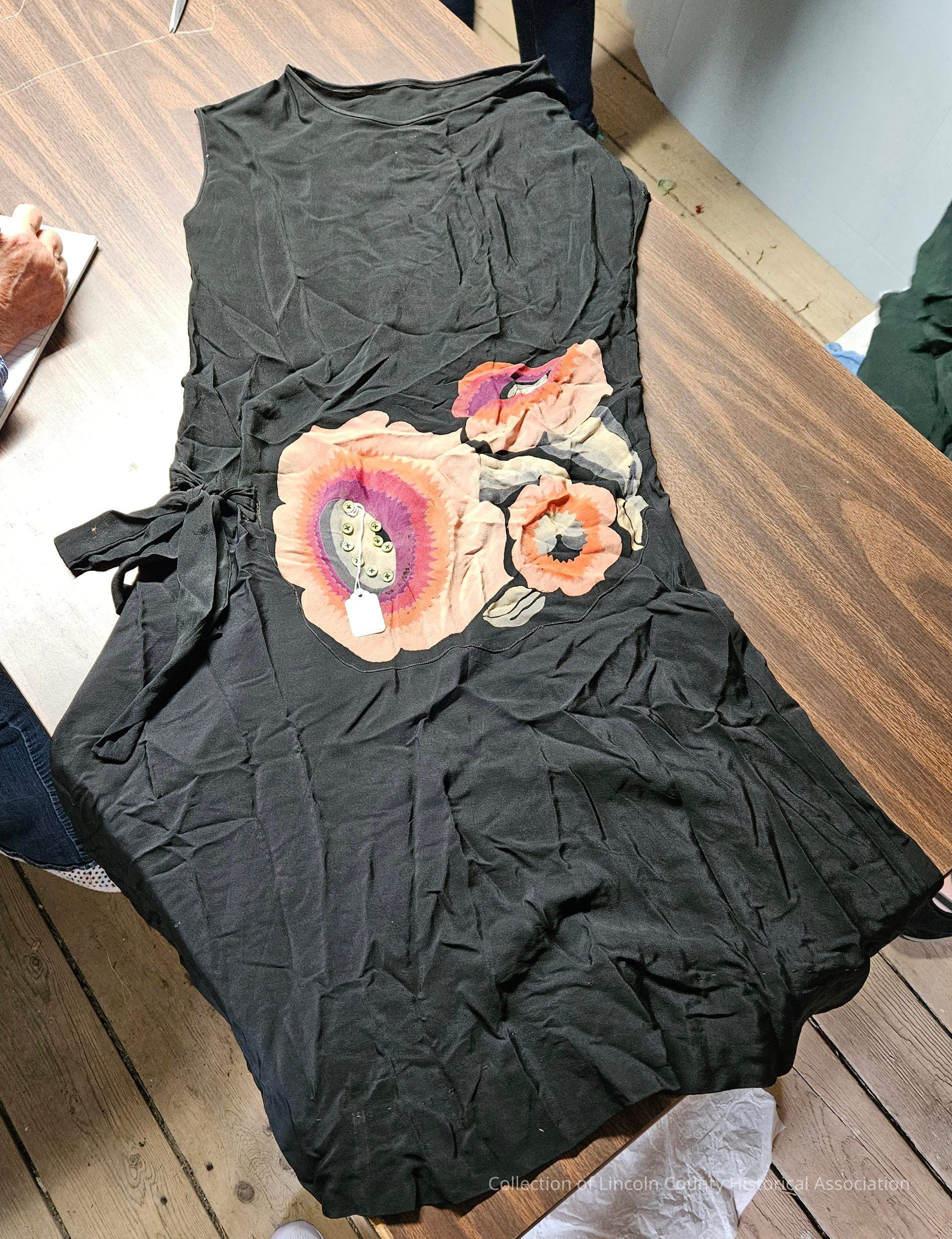 Black silk sleeveless short dress. Pink, purple, and orange floral design at waist. Yellow buttons in the center of largest flower at waist. Black tie at side of waist.Clothing/Dress/Costume Details
