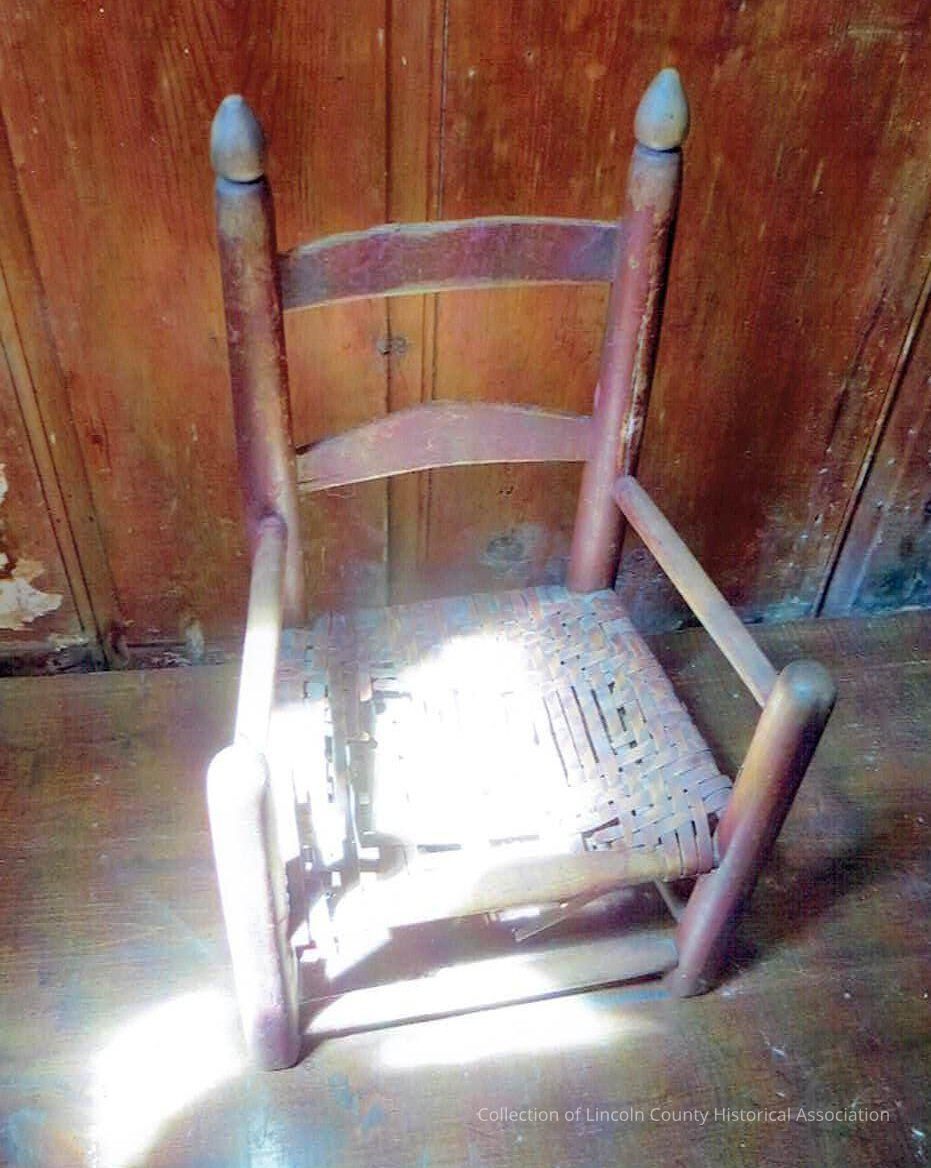 Child's armchair, ladder-back. Two slats, arched and turned posts with teardrop finials. Turned arms supported by turned front posts. Four simple side rails. Remnants of red paintInscription/Signature/Marks