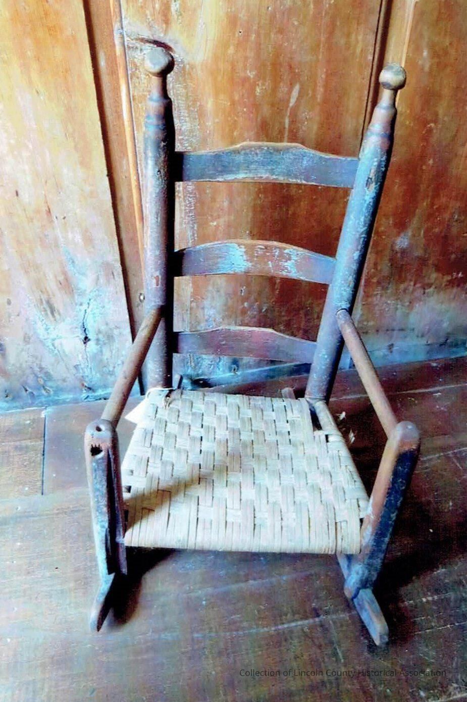 Significant wear to wooden parts. Loss of areas of painted finish. Proper right front post with serious break loss. The bore hole towards its top may indicate that this front post has been rotated 180 degrees. Finials atop the stiles show wear that would undicate that this chair was utilized by infants in process of learning to walk.