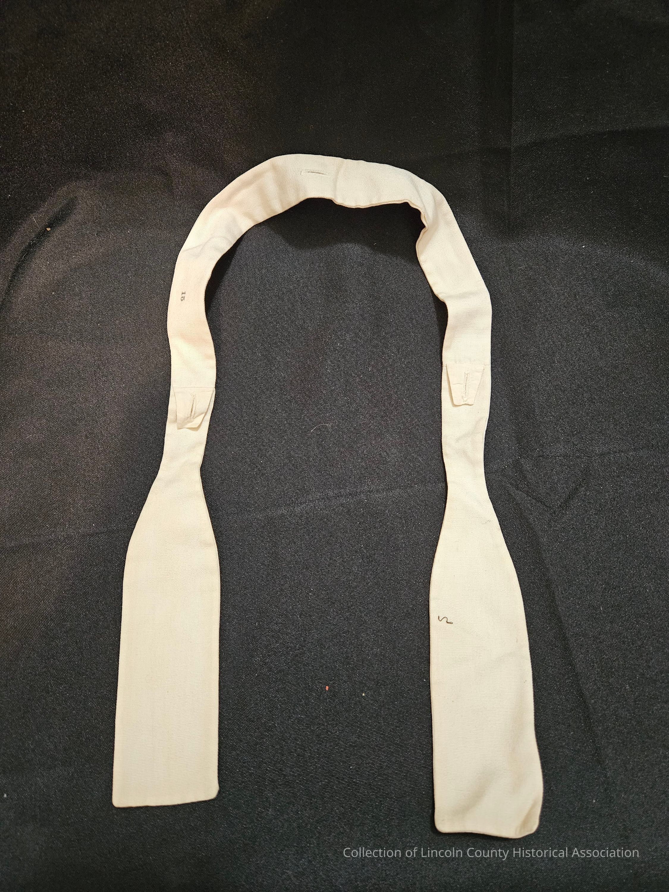 Plain white silk men's bowtie. Three button holes. Two of the button holes are on small attached flaps.