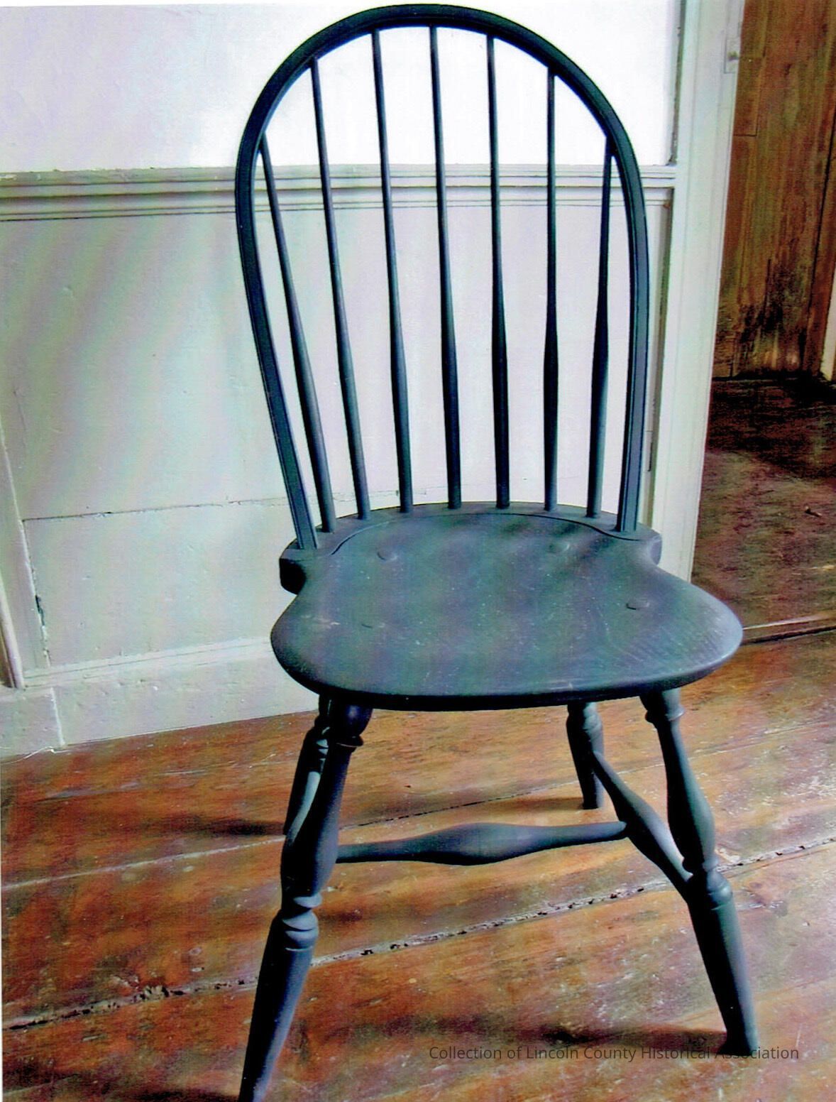 One of a set of four reproduction Windsor hall chairs. Greenish slate color