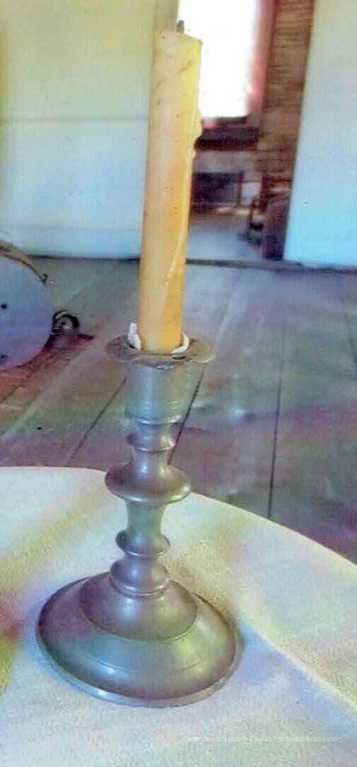 Candlestick with thin circular rim rests on cylinder incised with two thin lines. The stem below having four turnings and resting on a round base with incised circular lines. Beeswax candle.