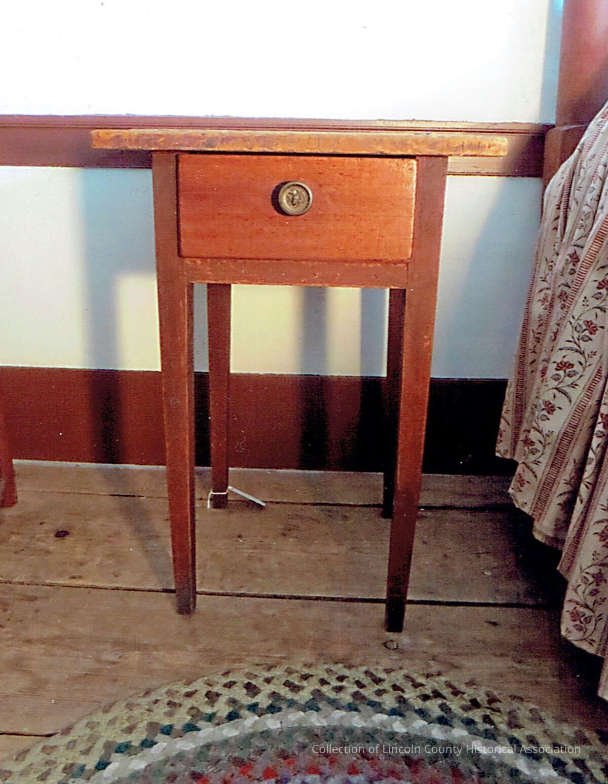 Square-topped end table, 4 tapered legs. One drawer with brass knob showing acorn. Top attached with cut nails.
